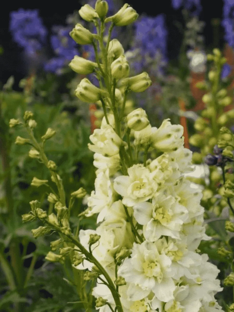 Дельфиниум культурный сорта *Sherbet Lemon* пленяет взор нежностью пастельных оттенков и утончённой грацией облика. Высокорослое растение достигает полутора метров высоты, украшая сад воздушными свечами соцветий, устремлёнными вверх подобно изысканным шпалерам. Листья крупные, пальчато-разделённые, тёмно-зелёной окраски, придают кусту благородную пышность и подчёркивают элегантность стеблей. Цветки собраны в рыхлые пирамидальные кисти длиной до полуметра, раскрываясь постепенно снизу вверх, создавая эффект непрерывности цветения. Лепестки окрашены в мягкие лимонно-жёлтые тона с едва уловимым кремовым оттенком, словно лепесток лимона, пропитанный солнечным светом. Бутоны слегка вытянутые, напоминают миниатюрные шлемики рыцарей древности, придавая растению особую декоративность. Предпочитает солнечные места и плодородные почвы, устойчив к холодам умеренного климата, радуя садоводов продолжительным периодом цветения с июня по сентябрь.