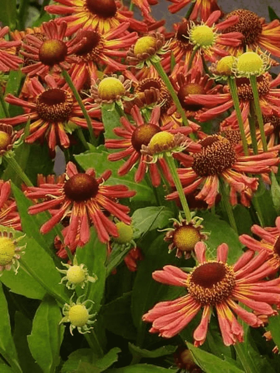 Гелениум осенний (*Helenium autumnale*) — многолетнее травянистое растение семейства астровых (Asteraceae), покоряющее сердца садоводов своей яркой палитрой и продолжительным цветением осенью. Стебли прямые, крепкие, высотой от полуметра до полутора метров, густо покрыты листьями ланцетной формы, слегка шероховатыми на ощупь, придающих растению особую декоративность даже вне периода цветения. Цветки гелениума собраны в крупные корзинки диаметром около пяти сантиметров, состоящие из центральных трубчатых цветков тёмно-коричневого цвета и краевых язычковых лепестков разнообразной окраски — оранжевой, жёлтой, красной или бронзово-медной, словно отражающих тёплые оттенки осени. Период цветения начинается в августе-сентябре и продолжается вплоть до первых заморозков, украшая сад яркими красками в пору увядания большинства растений. Предпочитает солнечные места и плодородную почву, легко размножается корневищем и семенами, широко распространён в садах Европы и Северной Америки благодаря неприхотливости и высокой декоративности.