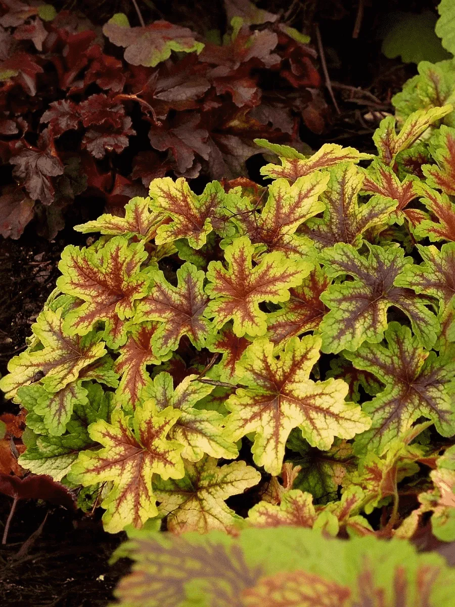 Гейхера сорта *Alabama Sunrise* пленяет взор нежностью весеннего рассвета, воплощённой в её роскошной листве. Листья округло-рассечённые, бархатистые, словно сотканные из солнечных лучей, переливаются оттенками золотисто-жёлтого цвета весной и летом, постепенно приобретая медово-розовый оттенок осенью. Их края украшены тонкими зелёными прожилками, придающими растению изысканный контраст. Цветки гейхеры собраны в рыхлые метельчатые соцветия нежно-кремового оттенка, возвышающиеся над листьями на стройных стеблях высотой до полуметра. Растёт медленно, формируя компактную куртинку диаметром около 45 см, предпочитая полутень и умеренно влажные почвы. Этот сорт идеально подходит для тенистых садов, рокариев и миксбордеров, где его декоративная зелень будет радовать глаз весь сезон, создавая атмосферу спокойствия и гармонии природы.