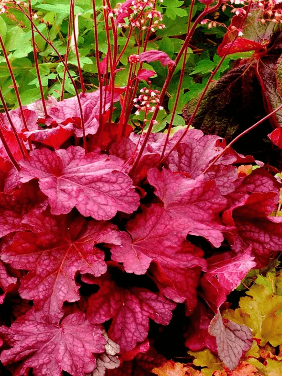 Гейхера сорта *Berry Smoothie* пленяет взор изысканным сочетанием нежной зелени и насыщенных ягодных оттенков, словно живописная палитра природы воплотилась в одном растении. Листья крупные, сердцевидные, слегка волнистые по краям, образуют пышную розетку, радующую глаз градиентом от изумрудно-зелёного до пурпурно-бордового цвета, переливающегося бронзовыми оттенками при ярком освещении. Цветоносы тонкие, стройные, поднимаются над листвой на высоту около полуметра, увенчанные мелкими, воздушными цветами кремово-белого оттенка, собранными в рыхлые метёлки, придающие гейхере особую утончённость и элегантность. Растёт медленно, формируя компактные кустики диаметром примерно 45 см, предпочитает полутень и умеренно влажные почвы, прекрасно адаптируясь к условиям средней полосы России и украшая сады своей декоративностью практически круглый год благодаря сохраняющейся привлекательности листвы даже после окончания цветения.