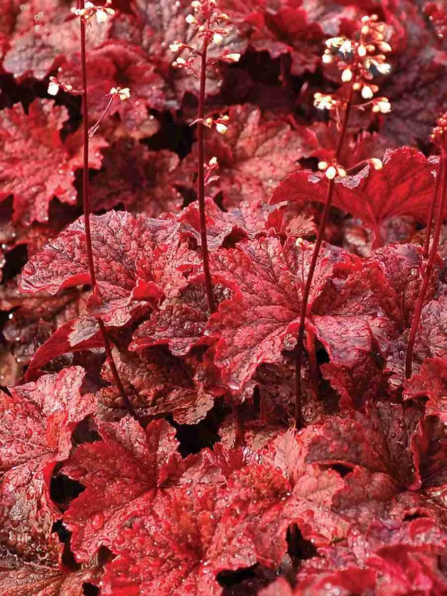 Гейхера сорта *Bloody Dinosaur* пленяет взор своей необычной декоративностью и изысканной красотой. Это компактное растение высотой около 45–60 см образует плотную розетку крупных пальчато-рассечённых листьев, словно вырезанных искусной рукой мастера. Листья обладают насыщенным бордовым оттенком с тёмно-красными прожилками, придающим растению сходство с древними окаменелостями, отчего оно и получило своё название. Цветовая палитра гейхеры меняется от сезона к сезону: весной листья приобретают ярко-зелёный оттенок с красноватыми крапинками, летом становятся густо-пурпурными, а осенью вспыхивают огненно-красными красками. Мелкие белые цветы собраны в рыхлые метельчатые соцветия, возвышающиеся над листвой на тонких прочных стеблях, создавая эффект воздушности и лёгкости. Растёт гейхера медленно, предпочитая полутень и умеренно влажные почвы, прекрасно дополняя тенистые сады и рокарии своим экзотическим обликом.
