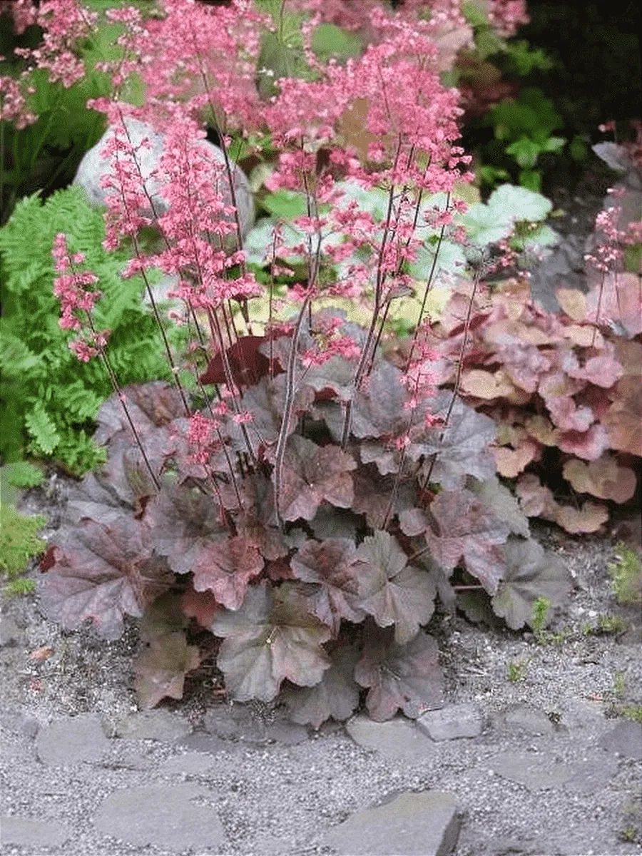 Гейхера сорта *Cassis* пленяет взор изысканным сочетанием форм и оттенков, представляя собой компактный кустик высотой около тридцати сантиметров с густой розеткой крупных пальчато-раздельных листьев, словно вырезанных искусной рукой мастера. Листья украшены глубокими разрезами и волнистыми краями, создавая впечатление кружевного полотна, переливающегося от бронзово-красного до пурпурно-бордового цвета, который усиливается осенью, приобретая насыщенные винно-шоколадные тона. Цветоносы возвышаются над листвой, демонстрируя нежные кремовые цветки, собранные в рыхлые метельчатые соцветия, придающие растению воздушность и лёгкость. Предпочитая полутень и умеренно влажную почву, гейхера *Cassis* прекрасно адаптируется к различным условиям сада, становясь украшением рокариев, бордюров и миксбордеров, где её бархатная зелень выгодно контрастирует с соседними растениями, подчёркивая свою неповторимую красоту и элегантность.