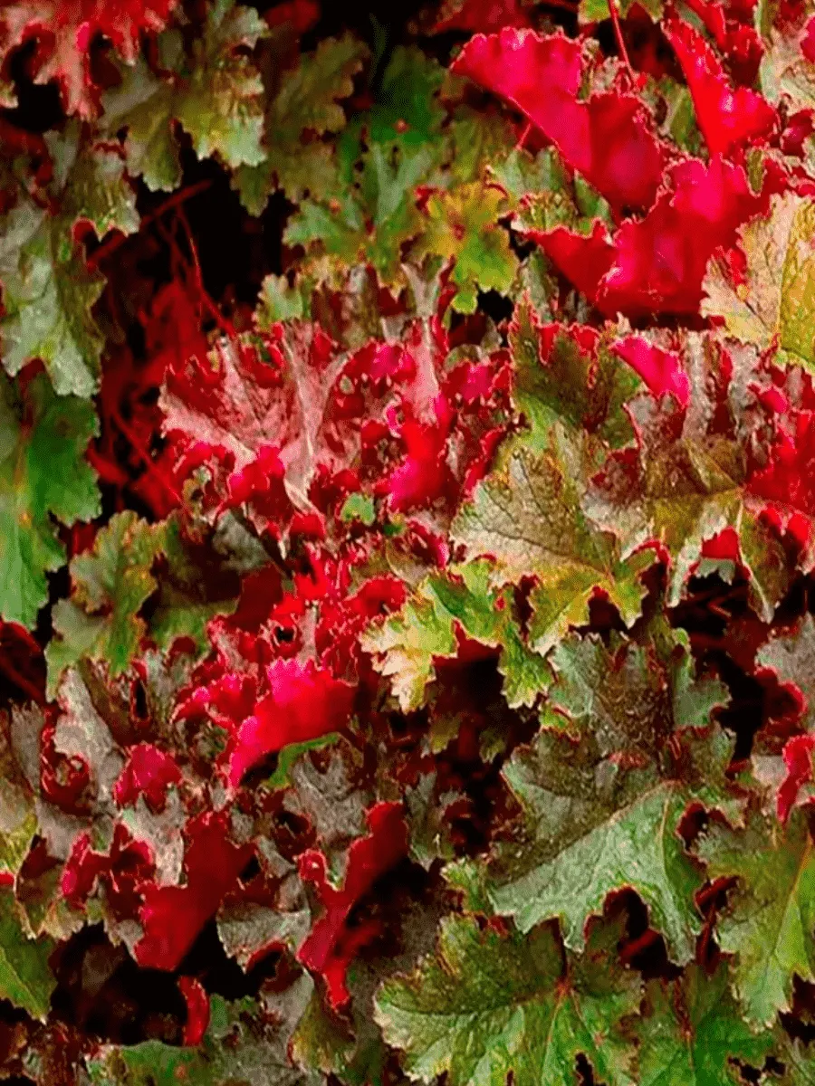 Гейхера сорта *Chocolate Ruffles* пленяет взор изысканным сочетанием бархатной окраски и ажурной формы листвы. Листья крупные, сердцевидные, рассечённые волнистыми краями, словно окутанные нежнейшей шоколадной глазурью, переливаются оттенками от тёмно-коричневого до пурпурного, создавая эффектную игру света и тени. Поверхность листа украшена тонкими прожилками, придающими ей особую глубину и рельефность. Цветки гейхеры собраны в рыхлые метельчатые соцветия, возвышающиеся над листьями на тонких прочных стеблях высотой около полуметра. Бутоны раскрываются мелкими колокольчатыми цветами нежно-розового оттенка, источающими тонкий аромат, привлекающий насекомых-опылителей. Растение предпочитает полутень и умеренно влажные почвы, прекрасно адаптируется к различным условиям произрастания, демонстрируя свою декоративность на протяжении всего сезона вегетации.
