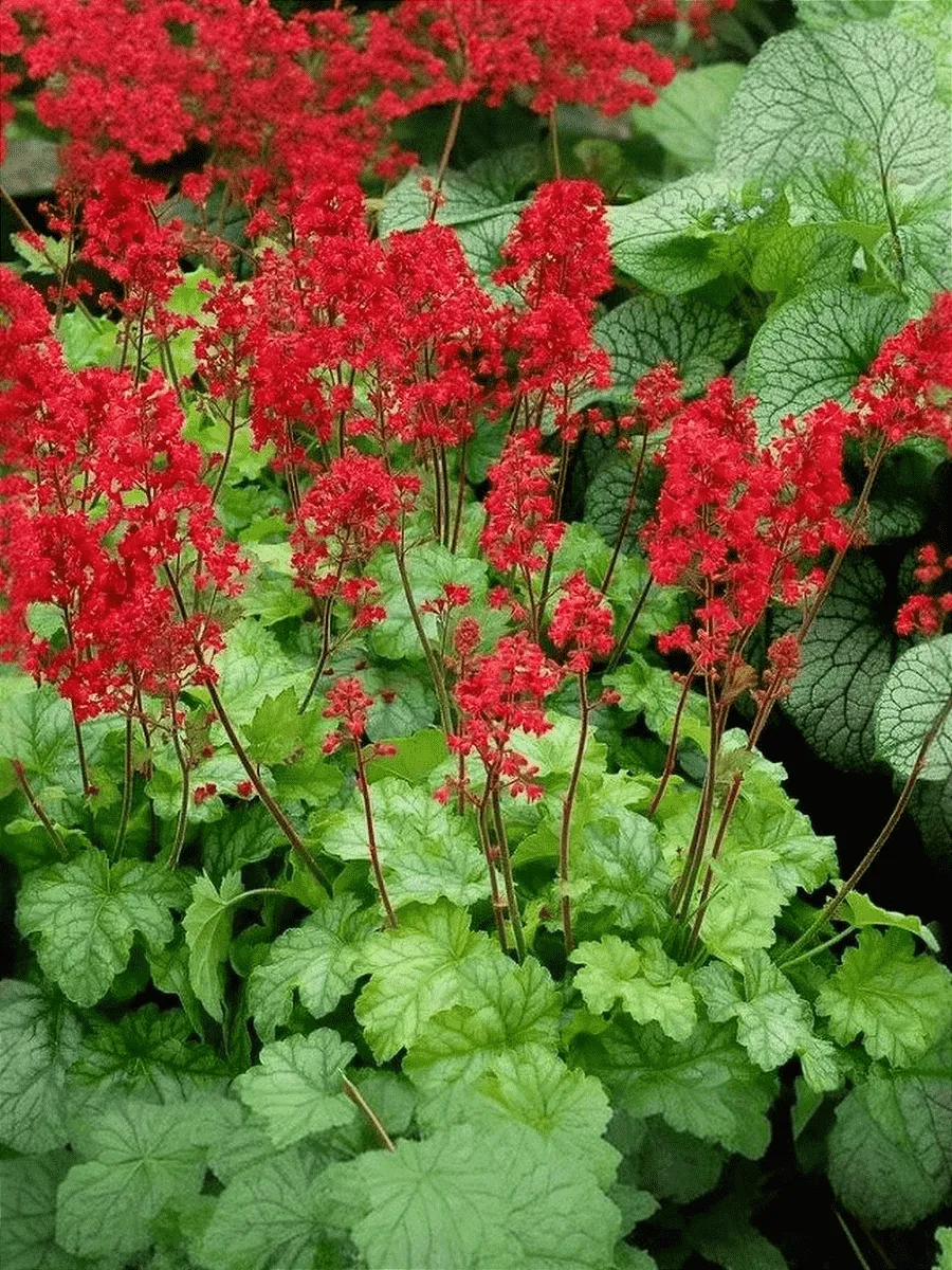 Гейхера сорта *Coral Forest* пленяет взор изысканным сочетанием нежной зелени и кораллово-розового оттенка, словно переливающегося драгоценностью среди садовых композиций. Листья её крупные, сердцевидные, рассечённые, будто вырезанные искусным мастером, украшены тонкими прожилками, придающими особую глубину цвету. Весной и летом растение покрывается пышными кистями мелких цветков нежно-кремово-белого цвета, возвышающихся над листвой на тонких прочных стеблях, создавая впечатление лёгкого воздушного облака. Корневая система гейхеры мощная, позволяющая ей уверенно закрепляться даже на каменистых участках, где другие цветы чувствуют себя неуверенно. Растёт медленно, формируя компактную куртинку диаметром около полуметра, идеально подходящую для бордюров, рокариев и миксбордеров. Осенью листья приобретают насыщенные бронзовые оттенки, продлевая декоративность до поздней осени.