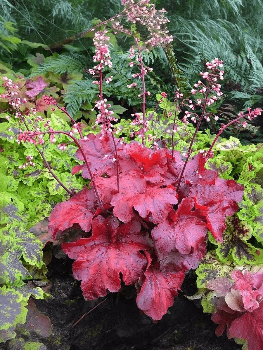 Гейхера сорта **Fire Alarm** пленяет взор своей яркой декоративностью и изысканной формой листвы. Листья крупные, сердцевидные, рассечённые по краям, словно вырезанные искусной рукой мастера, образуют пышную розетку высотой около 45 см. Их изумительная расцветка варьируется от насыщенно-красного до оранжевого оттенка, переливаясь огненными бликами на солнце и создавая эффект пламени, горящего среди зелёных насаждений сада. Цветки гейхеры мелкие, колокольчатые, собраны в рыхлые метельчатые соцветия нежно-розового цвета, возвышающиеся над листьями на тонких прочных стеблях. Растение предпочитает полутень и умеренно влажные почвы, прекрасно адаптируется к различным условиям произрастания, демонстрируя свою неприхотливость и устойчивость к неблагоприятным факторам среды. Благодаря своему яркому внешнему виду и длительному периоду цветения (с июня по август), гейхера Fire Alarm становится настоящим украшением любого садового участка, привнося в ландшафт нотки тепла и огня.