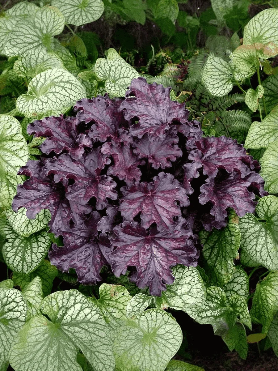 Гейхера сорта *Forever Midnight* пленяет взор своей изысканной декоративностью и утончённой красотой. Это компактное растение высотой около 45 см образует плотную куртинку густо расположенных крупных сердцевидных листьев, украшенных бархатной поверхностью глубокого тёмно-фиолетового цвета с серебристым отливом вдоль жилок. Листья словно покрыты тонким слоем благородной патины, придающей растению особую элегантность и загадочность. Цветоносы возвышаются над листвой, увенчанные мелкими розово-белыми цветами, собранными в рыхлые метельчатые соцветия, привлекающие внимание нежностью оттенков и воздушностью форм. Растёт гейхера медленно, постепенно разрастаясь и формируя живописные группы, прекрасно вписываясь в тенистые уголки сада, где её роскошная зелень становится ярким акцентом среди зелени трав и кустарников.