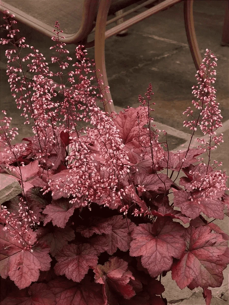 Гейхера гибридная сорта **Beaujolais** пленяет взор изысканным сочетанием форм и оттенков, превращаясь в истинную жемчужину сада. Её листья образуют плотную розетку, словно живописный веер, раскинутый над поверхностью земли. Листья крупные, сердцевидные, рассечённые глубокими зубцами, будто вырезаны искусной рукой мастера. Их поверхность бархатиста, украшена нежнейшими прожилками, придающими особую глубину и рельефность. Окраска варьируется от насыщенного бордового до тёмно-пурпурного цвета, переливаясь оттенками красного вина, что подчёркивает благородство и утончённость растения. Цветки гейхеры собраны в рыхлые метельчатые соцветия, возвышающиеся над листвой на стройных стеблях высотой около полуметра. Они мелкие, колокольчато-воронковидной формы, окрашены в нежно-розовый оттенок, создавая лёгкое облако цветов над роскошью листвы. Растёт гейхера медленно, формируя компактные кустики диаметром около 45 см, предпочитая полутень и умеренно влажные почвы, где раскрывается во всей своей красоте и очаровании.