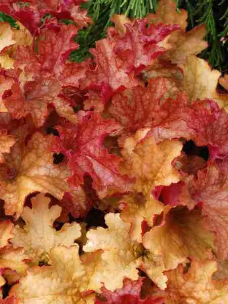 Гейхера сорта *«Ginger Peach»* пленяет взор нежной грацией своего облика и изысканной палитрой оттенков. Листья крупные, сердцевидные, рассечённые по краям, словно вырезанные искусным мастером, переливаются от золотисто-абрикосового до медово-кремового цвета, постепенно переходящего в насыщенные бронзовые тона ближе к осени. Стебли тонкие, прочные, поднимают над лиственной массой соцветия-метёлки, состоящие из мелких цветков нежно-розовых оттенков, украшенных тонкими тычинками, придающими особую воздушность и лёгкость общему виду растения. Цветёт гейхера продолжительно, начиная с конца весны и вплоть до середины лета, радуя глаз своей утончённой красотой. Предпочитает полутень и умеренно влажную почву, легко адаптируется к различным условиям произрастания, становясь украшением тенистых уголков сада и создавая атмосферу спокойствия и гармонии.