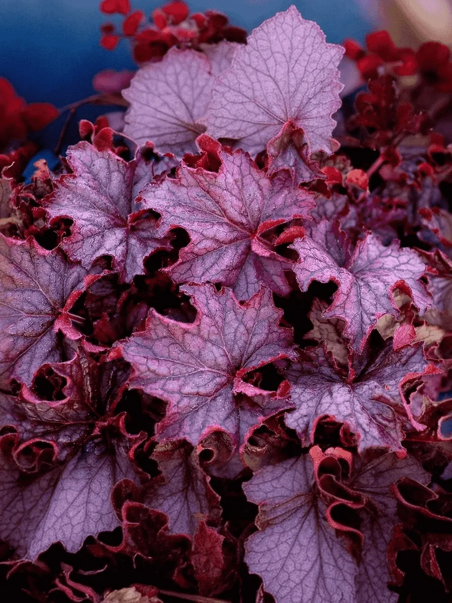Гейхера сорта *Grande Amethyst* пленяет взор роскошной листвой насыщенного пурпурно-фиолетового оттенка, переливающейся металлическим блеском при солнечном свете. Листья крупные, сердцевидные, слегка волнистые по краям, образуют пышную розетку высотой до полуметра, украшая садовый участок изысканным контрастом форм и цветов. Цветки мелкие, колокольчатые, нежно-розовые, собраны в рыхлые метельчатые соцветия, возвышающиеся над листьями на стройных прочных стеблях. Растение предпочитает полутень, прекрасно адаптируется к различным почвенным условиям, устойчиво к засухе и морозоустойчиво, благодаря чему широко используется в ландшафтном дизайне для украшения тенистых уголков сада, рокариев и альпийских горок.