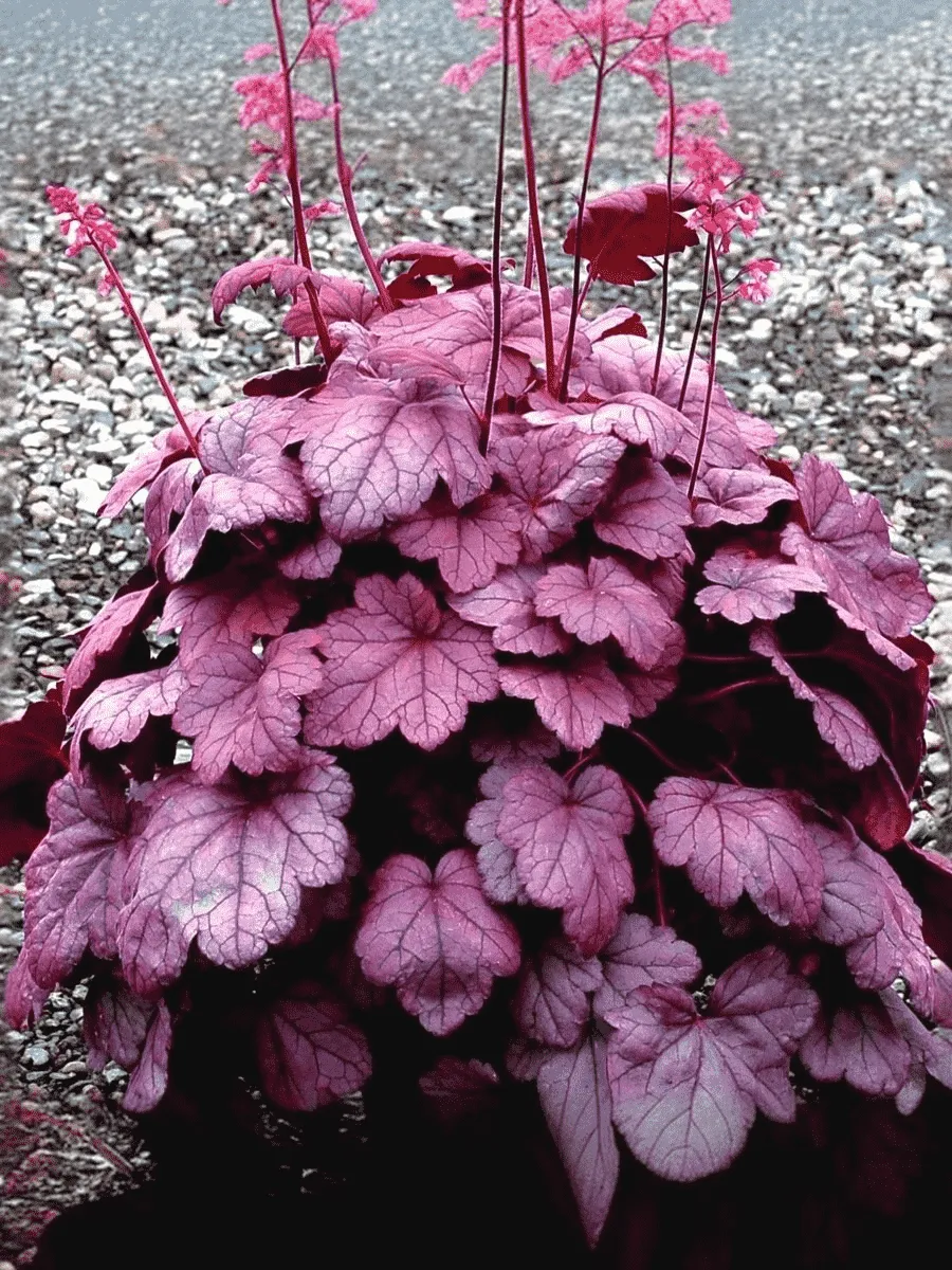 Гейхера сорта *«Grape Soda»* пленяет взор изысканным сочетанием нежной лиловости и серебристого блеска, словно переливающаяся поверхность прохладного напитка в жаркий день. Листья крупные, сердцевидные, слегка волнистые по краям, покрыты тонкой сетью прожилок, придающих поверхности эффект мерцания. Их бархатная фактура оттеняется насыщенным пурпурно-фиолетовым цветом, переходящим в дымчато-серебристый оттенок ближе к центру листа. Цветки мелкие, колокольчатые, собраны в рыхлые метельчатые соцветия нежно-розового оттенка, возвышающиеся над листьями на тонких прочных стеблях высотой до полуметра. Растение предпочитает полутень и умеренно влажную почву, прекрасно адаптируется к различным условиям выращивания, демонстрируя свою декоративность на протяжении всего сезона от весны до осени. Благодаря компактности куста и элегантному внешнему виду гейхеру широко используют в ландшафтном дизайне, создавая живописные композиции с контрастирующими растениями и подчеркивая её утончённую красоту.
