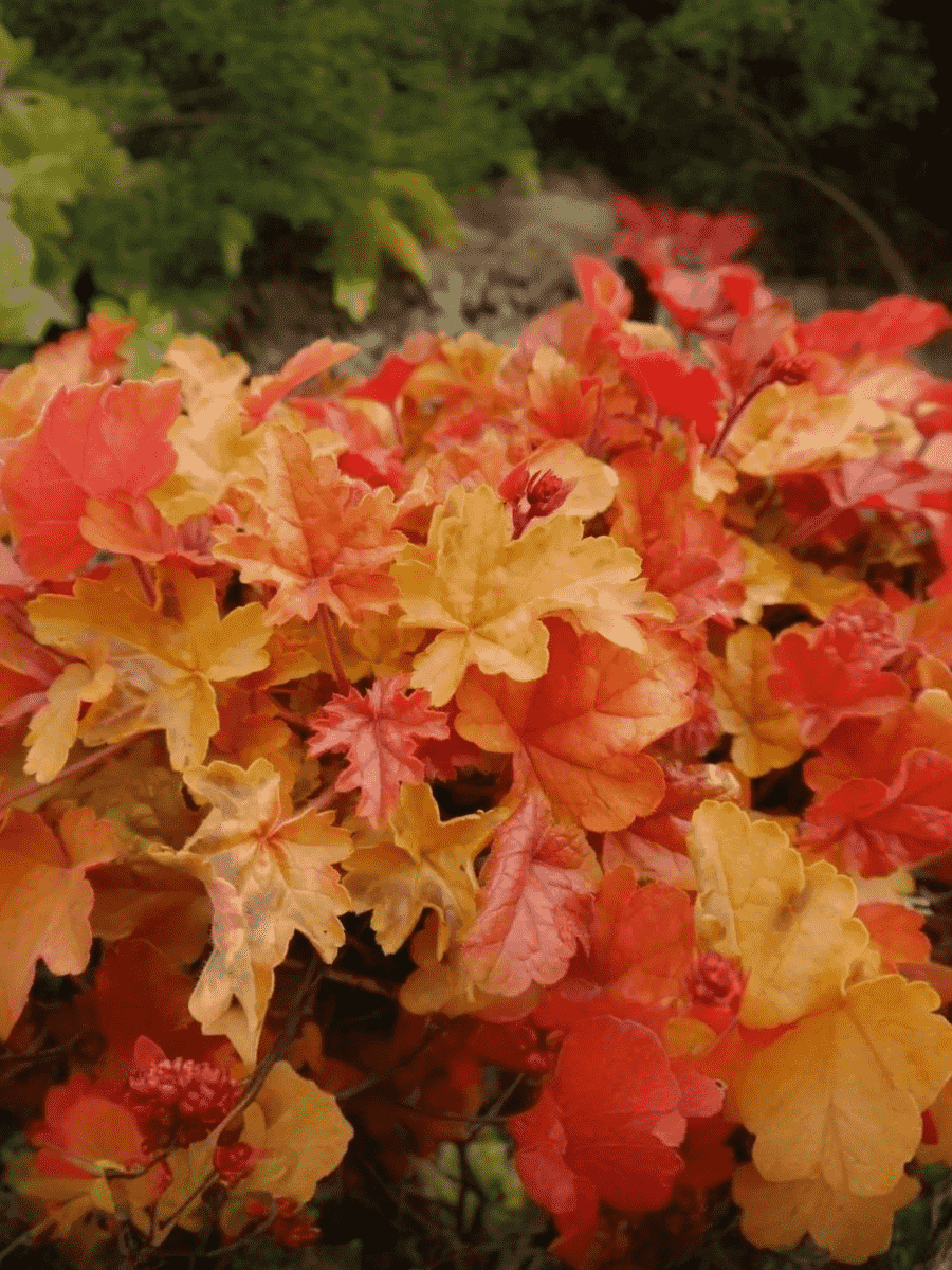 Гейхера сорта *Happy Autumn* пленяет взор своей изысканной декоративностью и удивительной палитрой осенних оттенков. Это компактное растение высотой около 45 см образует плотную розетку крупных сердцевидных листьев, украшенных волнистым краем и сетью тонких жилок. Листья гейхеры радуют глаз разнообразием окраски от насыщенно-зелёной весной до медово-жёлтой, оранжевой и даже пурпурной осенью, создавая эффект переливающихся красок. Цветоносы возвышаются над листвой, увенчанные мелкими белыми или светло-розовыми цветами, собранными в рыхлые метельчатые соцветия, придающие растению особую воздушность и лёгкость. Предпочитает полутень и умеренно влажные почвы, прекрасно адаптируется к различным условиям выращивания, демонстрируя свою неприхотливость и устойчивость к болезням. Благодаря своему привлекательному внешнему виду и длительному периоду декоративности гейхера *Happy Autumn* становится украшением любого сада, привнося в ландшафт гармонию природы и очарование осени.