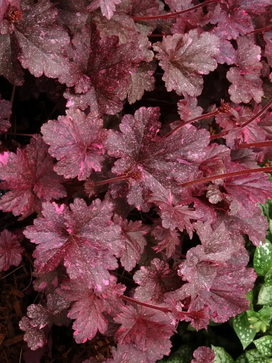 Гейхера сорта *Midnight Rose* пленяет взор своей изысканной красотой и утончённостью форм. Листья её крупные, сердцевидные, рассечённые по краям, словно вырезанные искусной рукой мастера, переливаются глубокими оттенками тёмно-фиолетового цвета с нежнейшими розовыми прожилками, будто тонкая паутина солнечных лучей легла поверх бархатной ткани ночи. Цветки мелкие, колокольчатые, собраны в рыхлые метельчатые соцветия нежно-розовых оттенков, возвышаются над листвой на тонких прочных стеблях, создавая впечатление лёгкого воздушного кружева. Растёт гейхера компактным кустиком высотой около тридцати сантиметров, предпочитая полутень и умеренно влажную почву, легко адаптируется к различным условиям произрастания, украшая сады и парки своим элегантным обликом на протяжении всего сезона вегетации.