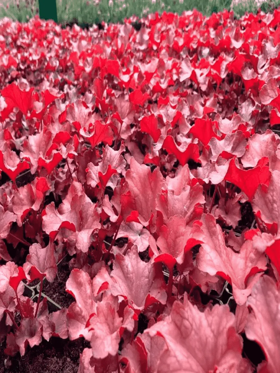 Гейхера сорта *Paprica* пленяет взор изысканным сочетанием форм и оттенков, превращаясь в истинную жемчужину сада. Листья её крупные, сердцевидные, рассечённые глубокими зубцами, словно вырезанные искусной рукой мастера, переливаются градиентом от насыщенно-красного до тёмно-бордового цвета, оттеняя друг друга подобно палитре художника. Цветки гейхеры Paprica собраны в нежные метельчатые соцветия, возвышающиеся над листвой на стройных стеблях высотой около полуметра, окрашены в приглушённый розово-пурпурный тон, создавая впечатление лёгкого облачного покрова над кустиком. Растёт гейхера медленно, формируя компактные куртины диаметром примерно 45–60 см, предпочитая полутень и умеренно влажные почвы, где раскрывается во всей своей красоте, украшая тенистые уголки садов и парков.