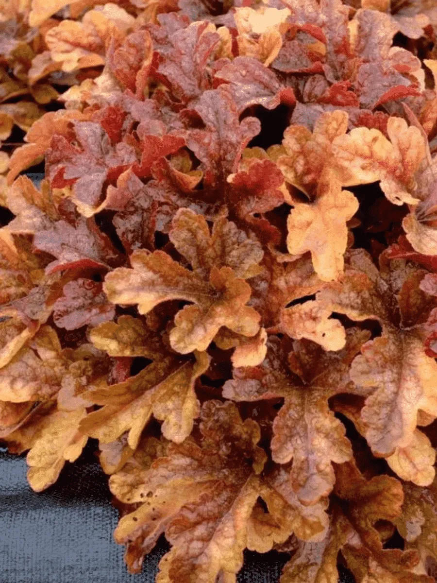 Гейхерелла сорта *Buttered Rum* пленяет взор нежной изысканностью своего облика. Листья её крупные, сердцевидные, рассечённые по краям тонкими зубчиками, словно искусная резьба старинного мастера. Окраска листвы переливается от золотисто-жёлтого до медово-оранжевого оттенка, приобретающего особую глубину и насыщенность осенью, когда листья становятся похожими на янтарь, согретый лучами солнца. Цветки гейхереллы мелкие, розовато-белые, собраны в рыхлые метельчатые соцветия, возвышающиеся над листьями на тонких прочных стеблях высотой около полуметра. Растёт она компактно, формируя плотную куртинку диаметром примерно 45–60 см, прекрасно украшая каменистые сады, альпийские горки и бордюры. Этот сорт отличается устойчивостью к холоду и неприхотливостью, легко адаптируясь к различным условиям выращивания, радуя садоводов своей декоративностью круглый год.