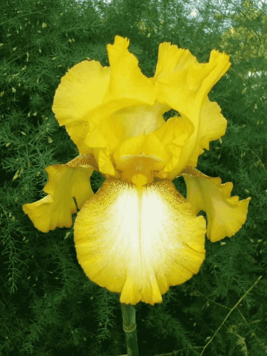 Ирис германский сорта *Radiant Apogee* пленяет взор изысканным сочетанием благородной формы и утончённой окраски. Его мощные вертикальные листья образуют плотную розетку, словно зелёная корона, венчающая основание цветка. Листья длинные, мечевидные, насыщенно-зелёного цвета, слегка блестящие, придающие растению строгость и величественность облика. Цветоносы устремляются вверх, достигая высоты до метра, увенчанные крупными цветами диаметром около десяти сантиметров. Лепестки цветков нежнейшего кремово-белого оттенка украшены золотисто-жёлтыми мазками и штрихами, создавая впечатление сияния и внутреннего свечения. Бутоны раскрываются постепенно, демонстрируя свою красоту в течение нескольких недель, превращаясь в настоящее украшение сада. Растёт этот великолепный представитель семейства ирисовых преимущественно на солнечных участках, предпочитая плодородные почвы и умеренный полив. Сорт отличается устойчивостью к болезням и неприхотливостью в уходе, радуя садоводов своей декоративностью долгие годы.