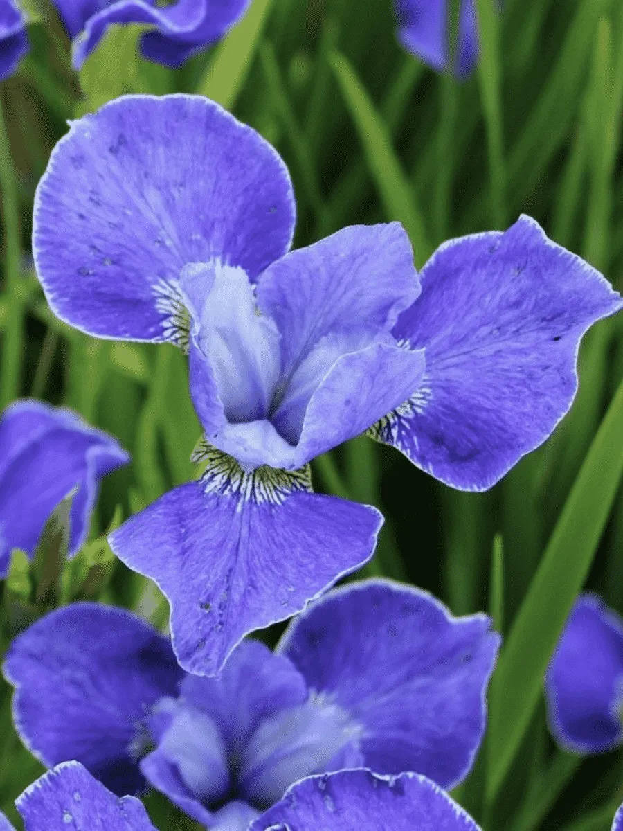 Ирис сибирский 'Silver Edge' пленяет взор своей утончённой красотой и благородством форм. Это многолетнее травянистое растение отличается стройностью облика и элегантной простотой линий. Листья узколинейные, ярко-зелёные, слегка дугообразно изгибаются от основания, словно тонкие зелёные ленты, окаймлённые серебристо-белым кантом, придающим особую декоративность растению даже вне периода цветения. Цветоносы высокие, прочные, несут крупные цветки насыщенного сине-фиолетового оттенка с бархатистым блеском, украшенные контрастными жёлтыми отметинами на нижних лепестках. Бутоны раскрываются постепенно, создавая эффектную композицию, привлекающую внимание своей изысканной цветовой гаммой и нежным ароматом. Растёт быстро, образует плотные кустики, легко размножается корневищами, прекрасно адаптируется к различным условиям произрастания, предпочитая солнечные места и умеренно влажные почвы. Прекрасно смотрится в одиночных посадках, миксбордерах и каменистых садах, где подчёркивает свою природную грациозность и аристократизм.