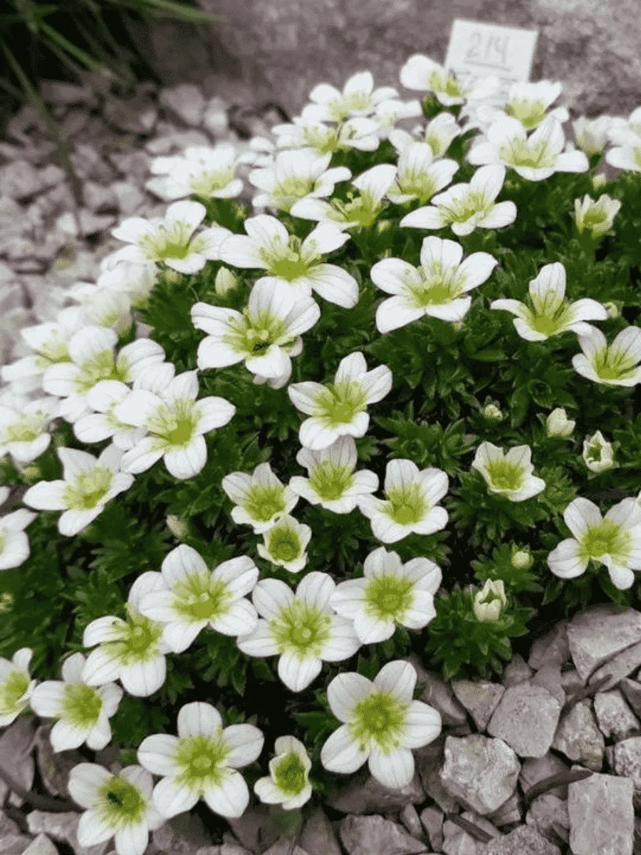 Камнеломка Арендса сорта *Saxony White* представляет собой компактную травянистую многолетнюю розетку высотой до 15 см, украшенную плотными кожистыми листьями насыщенно-зелёной окраски с лёгким серебристым отливом, слегка волнистыми краями и характерной рельефностью поверхности. Листья образуют густые аккуратные подушки, придающие растению декоративность даже вне периода цветения. Цветёт обильно и продолжительно, начиная с конца весны и вплоть до середины лета, покрываясь многочисленными белыми звёздчатыми цветами диаметром около 2–3 см, собранными в рыхлые зонтичные соцветия над лиственной массой. Растение предпочитает солнечные участки, хорошо дренированные почвы и умеренный полив, легко размножается делением куста и прекрасно подходит для каменистых садов, альпийских горок и бордюров, создавая живописные композиции благодаря своей неприхотливости и элегантному внешнему виду.