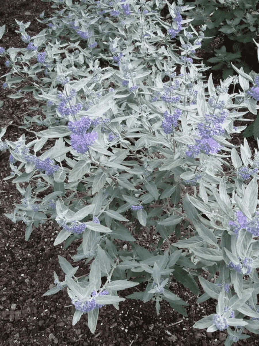 Кариоптерис кландоненсис 'Sterling Silver' представляет собой компактный кустарник высотой до одного метра с раскидистыми ветвями, покрытыми серебристо-серыми листьями необычной формы — овально-ланцетной, слегка волнистой по краю, словно вырезанной искусной рукой мастера. Листья густые, бархатистые, создают эффект мерцания на солнце, придавая растению особую декоративность даже вне периода цветения. Цветёт обильно и продолжительно, начиная с конца лета и вплоть до первых заморозков, покрываясь мелкими голубовато-фиолетовыми цветами, собранными в плотные щитки, источающими нежный аромат, привлекающий насекомых-опылителей. Растение неприхотливо, предпочитает солнечные места и хорошо дренированные почвы, устойчиво к засухе и холоду, легко переносит стрижку и формовку кроны, благодаря чему широко используется в ландшафтном дизайне для создания живых бордюров, групповых посадок и одиночных акцентов в садах и парках.