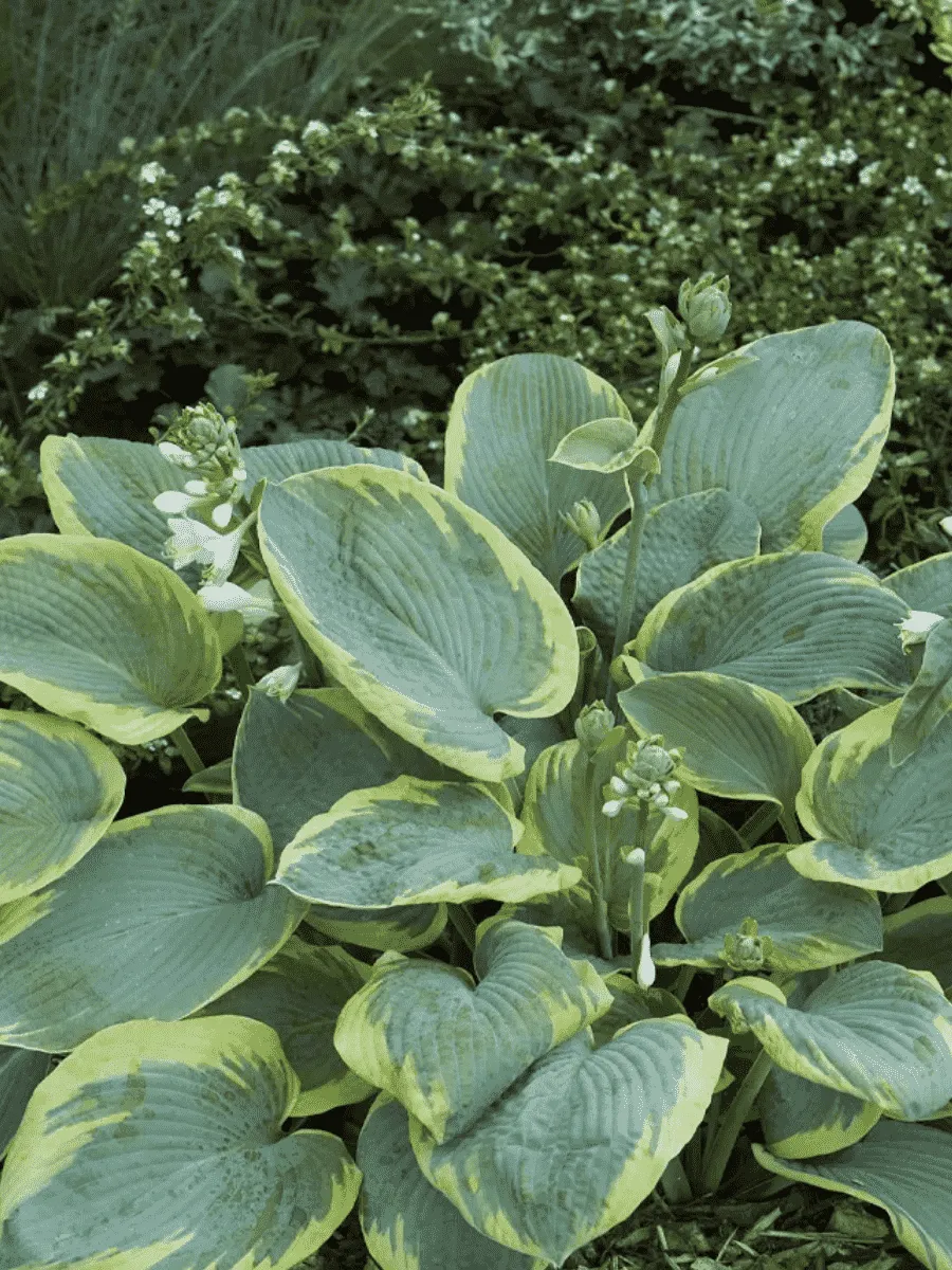 Хоста *Frances Williams* пленяет взор роскошной листвой, раскинувшейся живописным каскадом над поверхностью земли. Листья крупные, сердцевидные, слегка волнистые по краям, словно бережно вырезанные искусным мастером. Верхняя сторона листа украшена изумрудно-зелёным цветом с широкими золотисто-жёлтыми краями, контрастирующими друг с другом и придающими растению особую декоративность. Нижняя поверхность имеет нежную серебристо-сизоватую патину, добавляющую таинственности облику хосты. Цветки появляются летом, возвышаясь над листьями на стройных цветоносах высотой до полуметра, раскрываясь мелкими колокольчатыми цветами нежно-лилового оттенка, источающими тонкий аромат. Растёт медленно, формируя плотные кустистые куртины, предпочитая полутень и влажные плодородные почвы, где достигает своего полного великолепия, становясь украшением тенистых уголков сада.