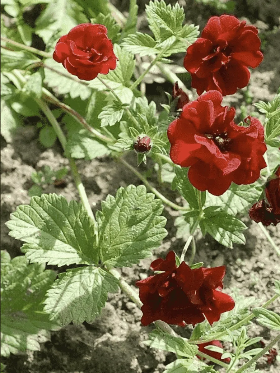 Лапчатка гибридная **Vulcan** — роскошный представитель семейства розоцветных, покоряющий сердца садоводов своей изысканной красотой и благородством форм. Это компактный кустарник высотой до одного метра, обладающий густой кроной и прямостоячими побегами, покрытыми нежной бархатистостью молодых ветвей. Листья лапчатки тёмно-зелёные, блестящие, перисто-рассечённые, словно искусно вырезанные миниатюрные кружева природы, придающие растению особую утончённость и элегантность. Цветки крупные, диаметром около восьми сантиметров, собраны в пышные соцветия, поражают насыщенным рубиново-красным оттенком лепестков, контрастирующим с золотистыми тычинками, создавая впечатление огненного пламени среди зелени сада. Период цветения продолжительный, начинается в июне и длится до поздней осени, наполняя пространство вокруг себя яркими красками и ароматом лета. Растёт быстро, легко адаптируется к различным условиям выращивания, предпочитая солнечные места и плодородную почву, становясь украшением любого участка благодаря своему декоративному облику и неприхотливости.