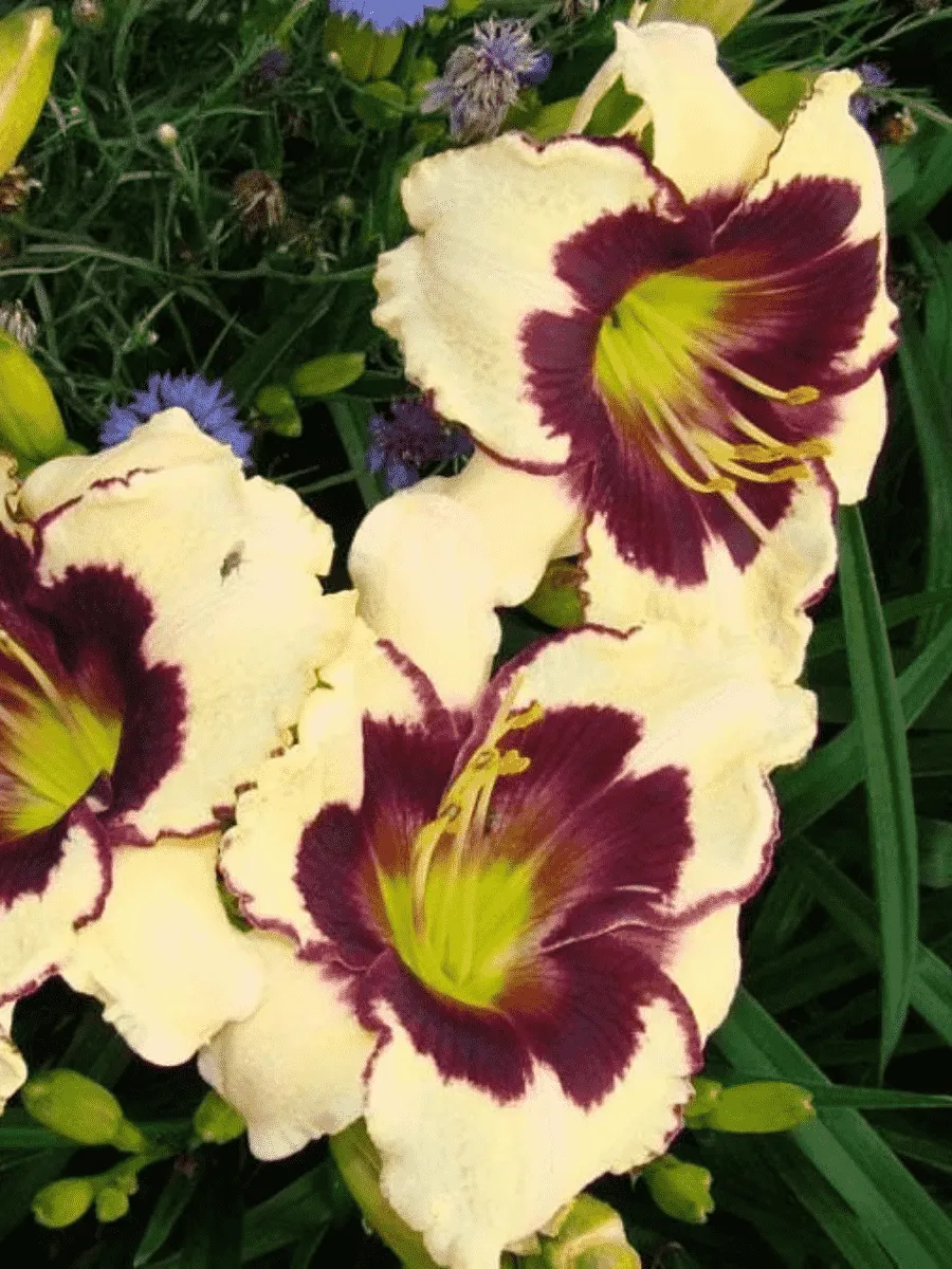 Лилейник *Celebration of Angels* пленяет взор изысканным сочетанием нежности и благородства форм. Его листья узколанцетной формы собраны в плотную прикорневую розетку, создавая живописный фон для роскошных цветков. Цветоносы возвышаются над листвой, достигая высоты около метра, увенчанные крупными бутонами, раскрывающимися в пышные цветы диаметром до 15 см. Лепестки цветка окрашены в переливчатый кремово-белый оттенок с золотисто-жёлтым центром, украшенным тонкими пурпурными штрихами, придающими особую утончённость композиции. Период цветения продолжительный, начинается в середине лета и длится несколько недель, наполняя сад ароматом и очарованием. Растение неприхотливо, устойчиво к болезням и неблагоприятным условиям среды, прекрасно адаптируется к различным типам почв и освещённости, становясь украшением любого сада своей элегантностью и грациозностью.