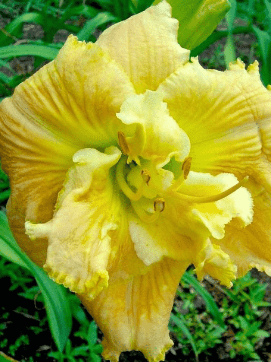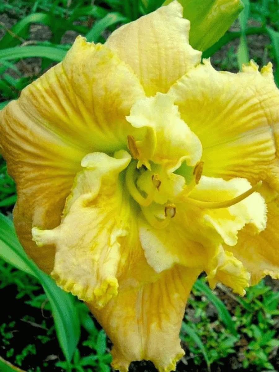 Лилейник *Dynamic Duo* пленяет взор своей изысканной красотой и элегантностью форм. Это многолетнее травянистое растение образует плотную розетку длинных узких листьев насыщенного зелёного цвета, слегка дугообразно изгибающихся от основания, словно струи воды, стекающие с края фонтана. Листья гладкие, блестящие, придающие растению благородство и утончённость облика даже вне периода цветения. Цветоносы возвышаются над лиственной массой, достигая высоты около метра, увенчанные крупными эффектными цветами диаметром до 15 см. Лепестки цветка имеют необычную двухцветную окраску: верхние лепестки окрашены в нежнейший кремово-жёлтый оттенок, плавно переходящий в золотисто-оранжевый центр, нижние же лепестки украшены яркими красно-коричневыми мазками, контрастирующими с основной палитрой. Такое сочетание цветов создаёт впечатление живописной картины, написанной рукой талантливого художника. Период цветения длится несколько недель, начиная с середины лета, когда раскрывшиеся бутоны источают тонкий аромат, привлекающий насекомых-опылителей. Растёт быстро, легко размножается вегетативно, прекрасно адаптируется к различным условиям произрастания, предпочитая солнечные места и плодородные почвы.