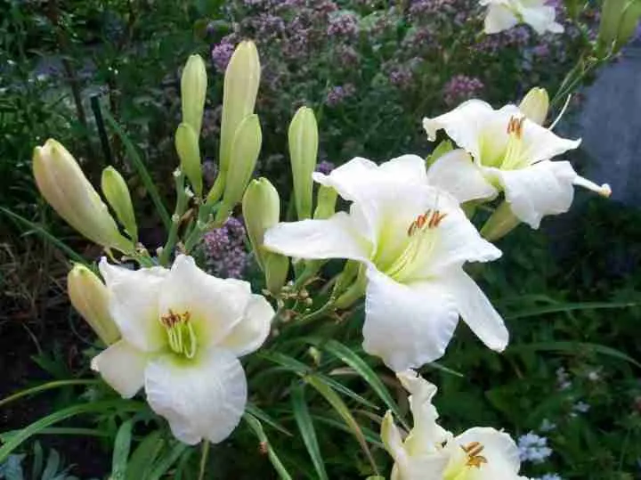 Лилейник *Hemerocallis* сорта **«Gentle Shepherd»** пленяет взор нежностью пастельных оттенков и утончённой грацией форм. Его листья узколанцетные, слегка волнистые по краям, образуют пышную зелёную розетку высотой около полуметра, словно живописная живая рамка вокруг изысканного цветка. Цветки крупные, диаметром до 15 см, распускаются один за другим на высоких прочных цветоносах, возвышаясь над листвой подобно светлым фонарикам. Лепестки нежно-розовые, плавно переходящие в кремово-белый центр, украшены тонкой золотистой каймой и едва заметной штриховатостью, придающей особую глубину оттенкам. Бутоны раскрываются утром и увядают вечером, сменяя друг друга почти непрерывно всё лето, создавая впечатление непрерывного цветения. Растёт быстро, образует плотные кустики, легко размножается делением корневища и прекрасно адаптируется к различным условиям выращивания, радуя садоводов своей неприхотливостью и декоративностью долгие годы.