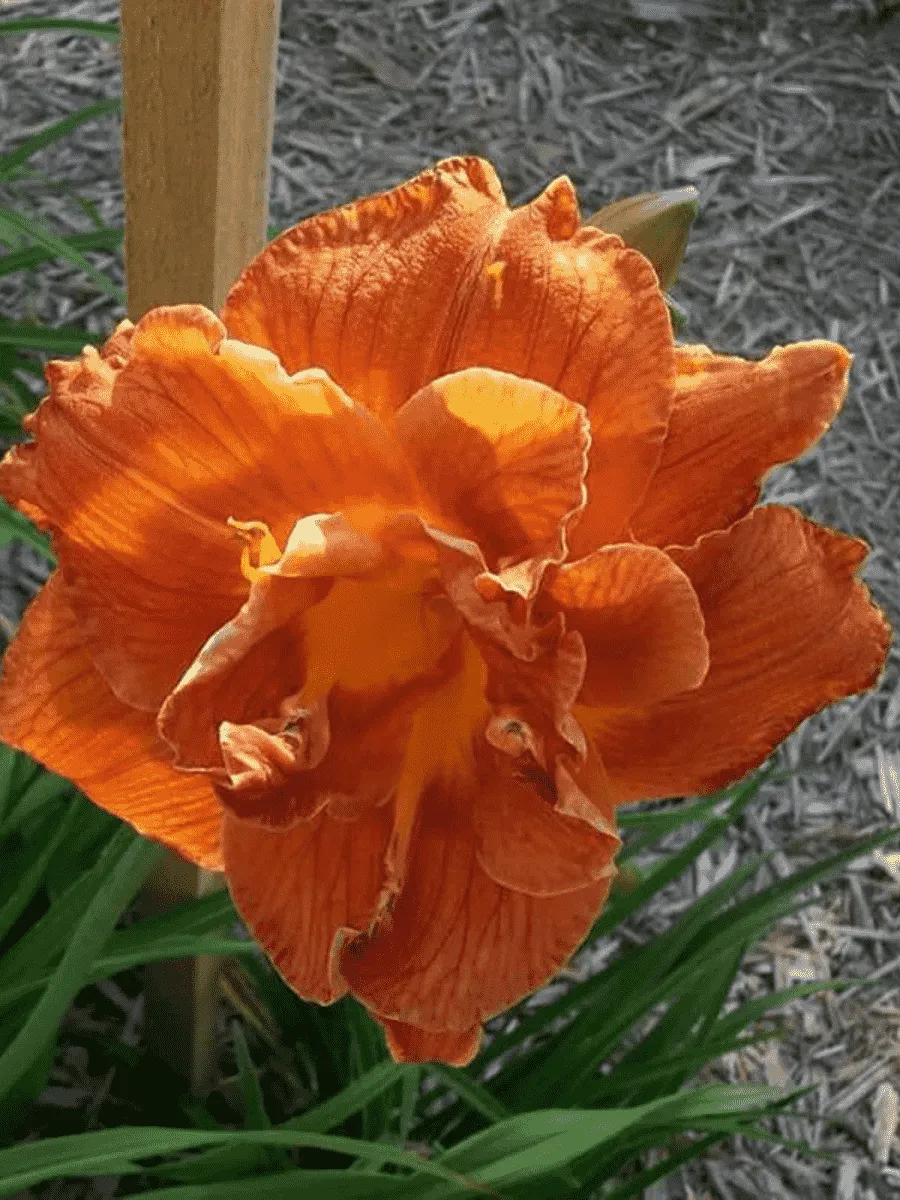 Лилейник гибридный *Doublelicious* пленяет взор роскошной пышностью цветения и благородством форм. Его мощные прямостоячие листья образуют плотную прикорневую розетку, создавая живописный фон для эффектных соцветий. Листья длинные, узколанцетные, насыщенно-зелёного цвета, слегка волнистые по краям, придают растению элегантность и утончённость. Цветоносы высокие, крепкие, несут крупные махровые цветки диаметром до 15 см, собранные в рыхлые кисти. Лепестки цветка нежные, бархатистые, кремово-жёлтого оттенка с золотистым отливом, украшенные тонкой сеточкой оранжево-красных прожилок, придающих особую изысканность и глубину цвету. Период цветения продолжительный, начинается в середине лета и длится около месяца, наполняя сад ароматом и очарованием экзотической красоты. Растёт лилейник быстро, образует густые куртины, легко размножается вегетативно и прекрасно адаптируется к различным условиям выращивания, предпочитая солнечные места и плодородные почвы.
