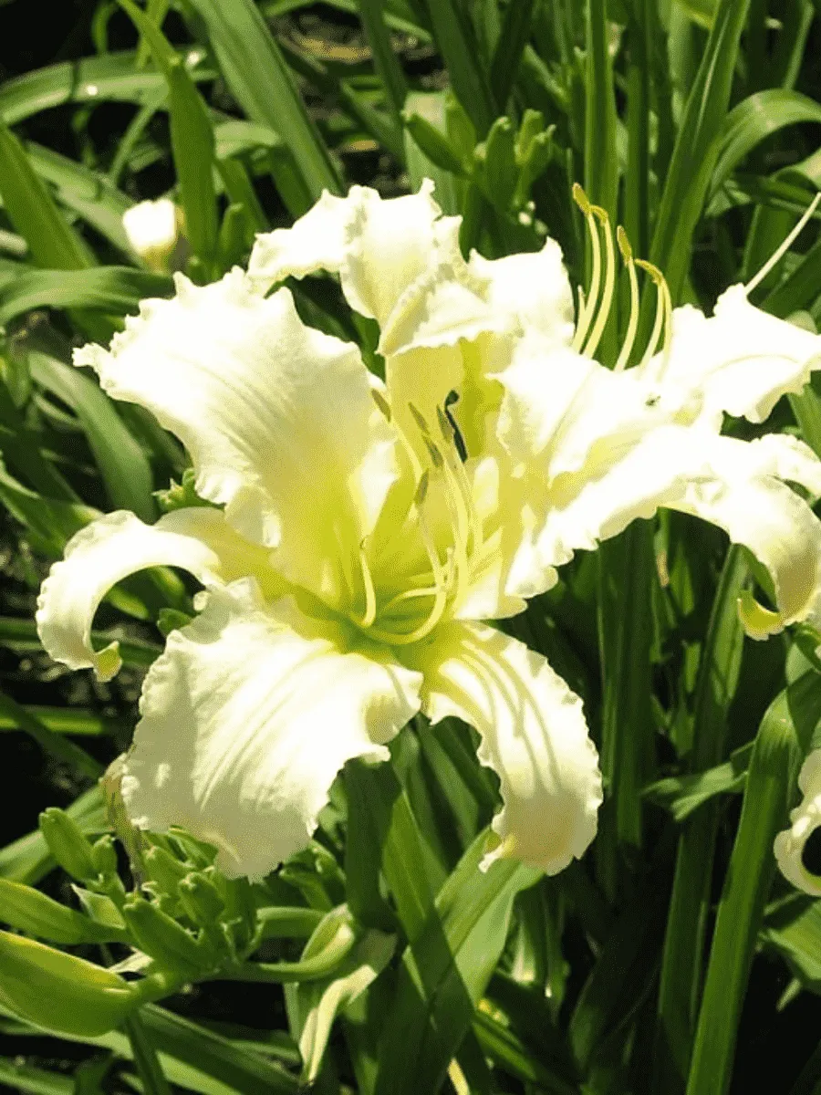 Лилейник *Heavenly Angel Ice* пленяет взор нежностью белоснежных лепестков, словно сотканных из утренней дымки и украшенных едва заметной серебристо-голубоватой каймой, придающей цветкам особую воздушность и утончённость. Листья узколанцетные, ярко-зелёные, слегка волнистые по краям, образуют пышную прикорневую розетку, подчёркивая элегантность соцветий. Цветоносы высокие, стройные, несут крупные цветки диаметром до 15 см, раскрывающиеся один за другим, создавая эффект продолжительного цветения с июня по август. Растение неприхотливо, устойчиво к болезням и неблагоприятным условиям среды, прекрасно адаптируется к различным типам почв и освещённости, становясь украшением садов и парков, где царит гармония природы и искусства.