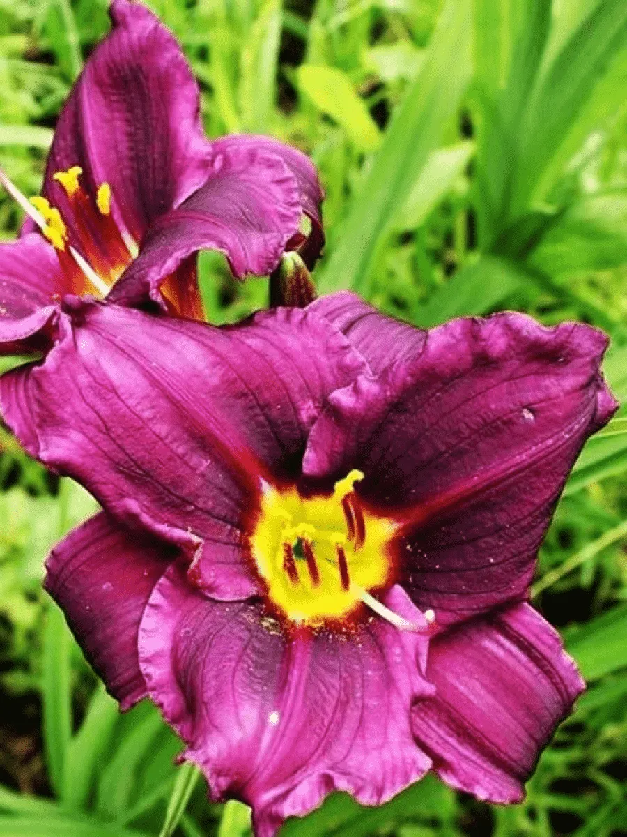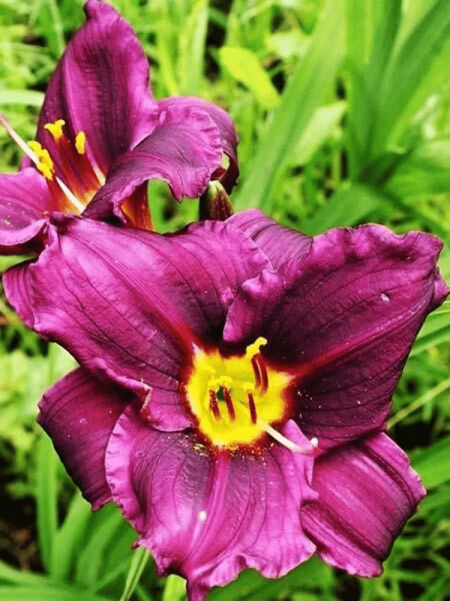 Лилейник *Super Purple* пленяет взор роскошной палитрой оттенков фиолетового цвета, переливающегося от насыщенного пурпурного до глубокого бархатистого тона. Его широкие мечевидные листья образуют плотную прикорневую розетку, создавая живописный фон для эффектных цветков. Цветоносы устремляются вверх, достигая высоты около метра, увенчанные крупными бутонами диаметром до 15 см. Лепестки цветка слегка волнистые, края чуть загнуты назад, придавая особую грациозность соцветиям. Сердцевина каждого лепестка украшена тонкой золотистой полоской, контрастирующей с глубоким цветом венчика. Период цветения продолжительный, растение радует глаз яркими цветами с июня по август. Предпочитает солнечные места, легко адаптируется к различным типам почв, устойчиво к засухе и морозоустойчиво, благодаря чему широко распространено в садах и парковых композициях умеренной климатической зоны.