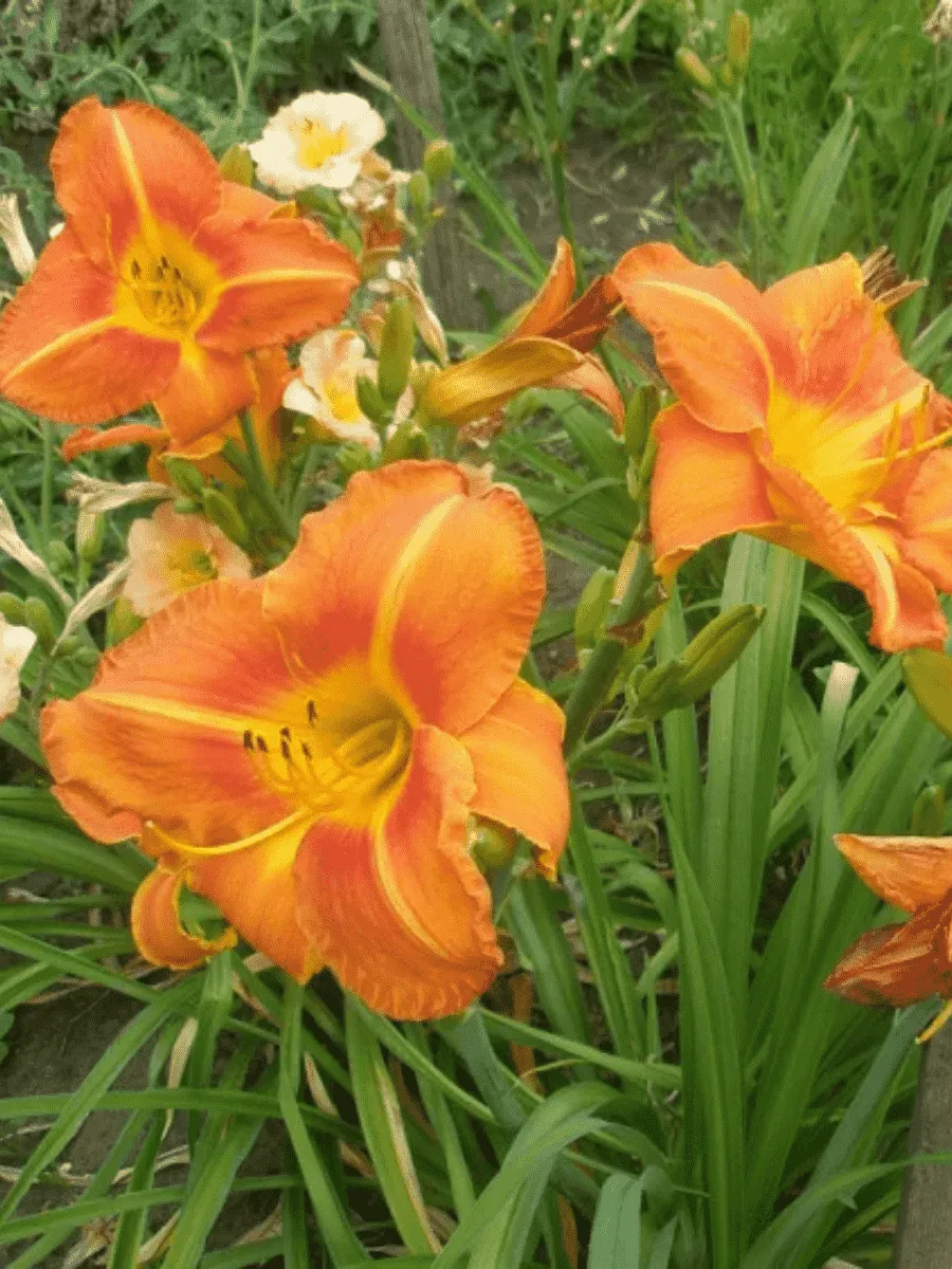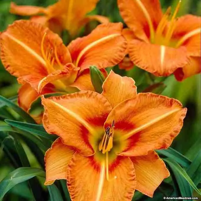 Лилейник **Tuscawilla Tigress** пленяет взор роскошной палитрой оттенков и грациозностью форм. Его широкие листья образуют пышную розетку, словно зелёная манишка, окаймляющая основание стебля. Листья длинные, слегка дугообразные, насыщенного изумрудного цвета, придающие растению элегантность и благородство облика. Цветоносы возвышаются над листвой, достигая высоты около метра, увенчанные крупными бутонами, раскрывающимися в великолепие цветков диаметром до 15 см. Лепестки цветка окрашены в глубокий медово-жёлтый тон с яркими оранжевыми мазками и штрихами, создавая эффект тигровой расцветки. Центр каждого лепестка украшен контрастной тёмно-коричневой полосой, подчёркивающей изысканность рисунка. Цветение продолжается несколько недель, наполняя сад нежным ароматом и притягивая внимание своей живописностью. Растёт быстро, образует плотные куртины, легко размножается делением корневища и прекрасно адаптируется к различным условиям выращивания, предпочитая солнечные места и плодородные почвы.