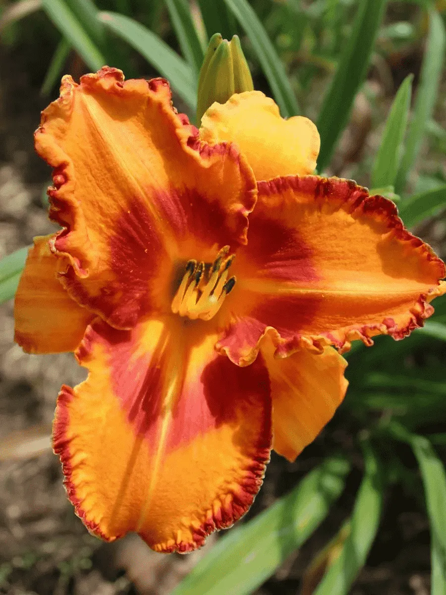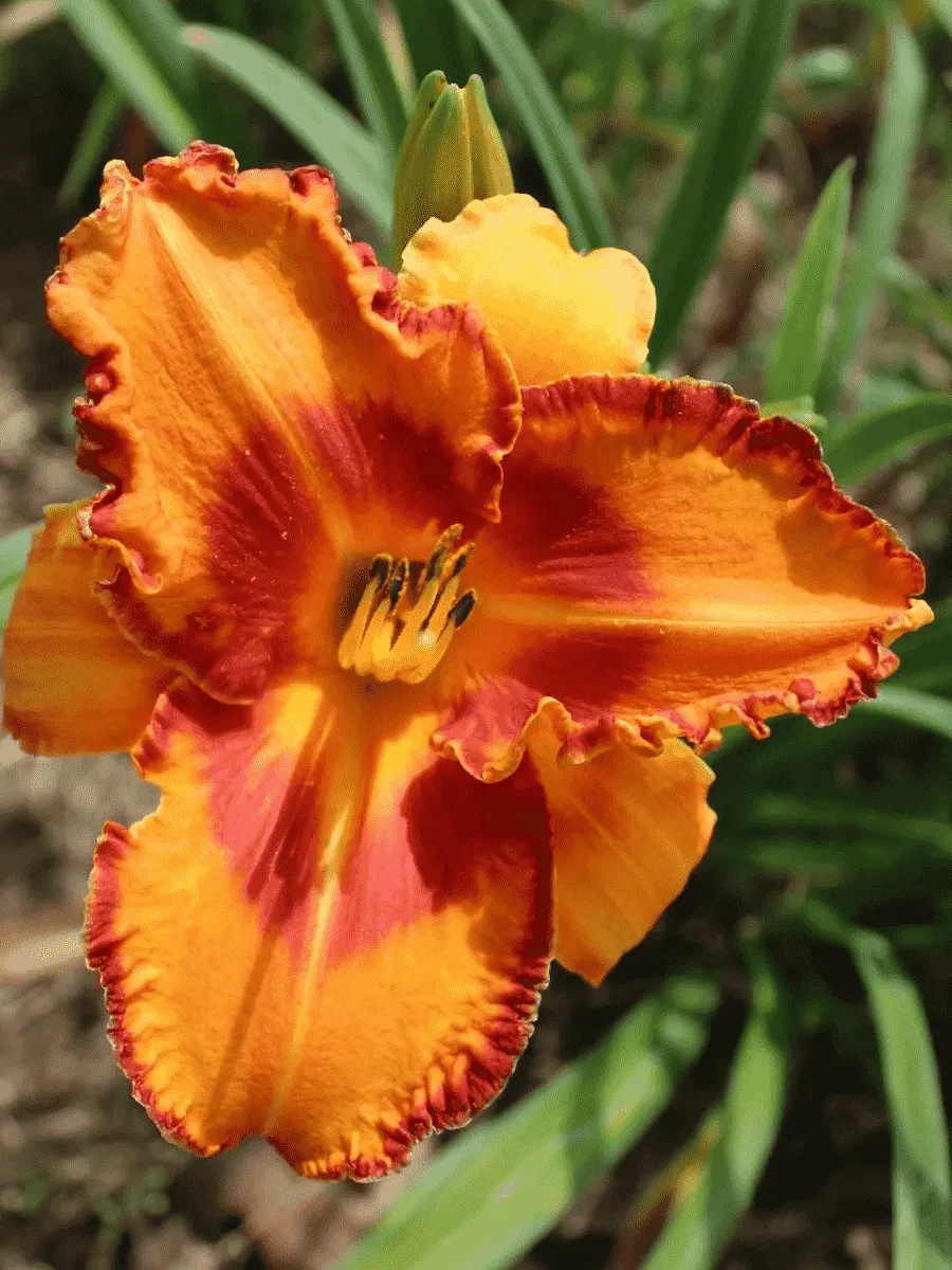 огненно-оранжевая с красным глазом, желто-зеленым горлом и гофрированной двойной красно-золотой каймой по краям внутренних лепестков