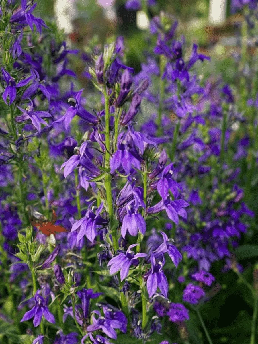 Лобелия прекрасная сорта *Fan Blue* пленяет взор нежностью своего облика и изысканностью форм. Это компактное травянистое растение высотой около 15–25 см образует аккуратную розетку узких ярко-зелёных листьев, слегка волнистых по краям, придающих кустику лёгкость и воздушность. Цветки собраны в рыхлые кистевидные соцветия, возвышающиеся над листвой, словно миниатюрные свечи, украшенные венчиками небесной голубизны с едва заметным белым глазком в центре. Лепестки цветков тонкие, шелковистые, будто сотканные из утренней дымки, придают растению особую утончённость и очарование. Период цветения продолжительный, начинается в июне и длится до первых заморозков, наполняя сад волшебством своей красоты и свежести. Предпочитает солнечные места, хорошо дренированные почвы и умеренный полив, легко размножается семенами и черенкованием, быстро формируя живописные группы и создавая яркие акценты в миксбордерах, рокариях и контейнерах.
