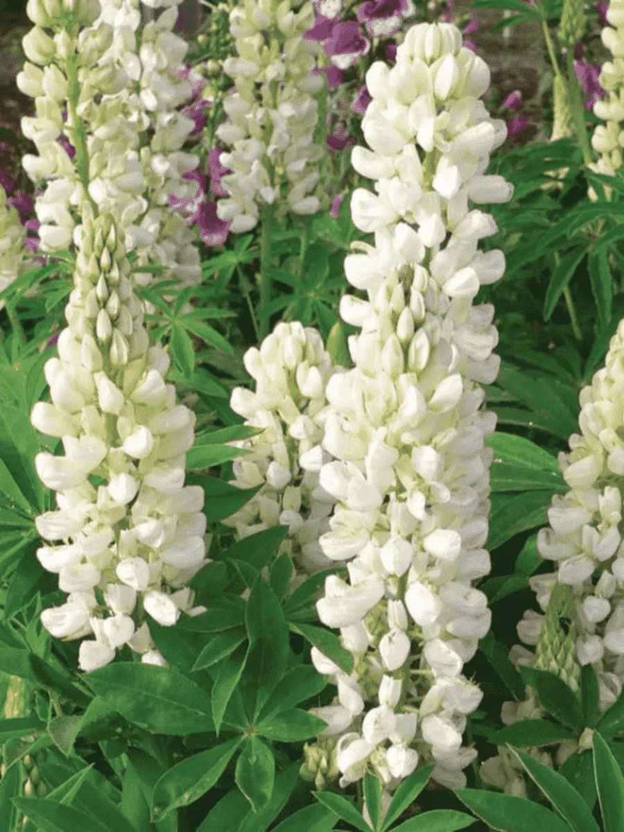 Люпин многолистный сорта *Legendary White Shades* пленяет взор своей утончённой красотой и благородством форм. Высокий стройный стебель достигает полутора метров высоты, увенчанный пышной кистью крупных цветков нежнейшей бело-кремовой окраски, переливающихся оттенками слоновой кости и жемчужного серебра. Листья глубоко рассечённые, пальчатораздельные, состоят из множества узких листочков насыщенного зелёного цвета, придающих растению особую воздушность и лёгкость. Цветёт люпин продолжительно, начиная с конца мая до середины июля, наполняя сад изысканным ароматом и создавая атмосферу спокойствия и гармонии. Растение предпочитает солнечные места, хорошо дренированные почвы и умеренный полив, легко адаптируется к различным климатическим условиям, украшая собой сады, парки и природные ландшафты.