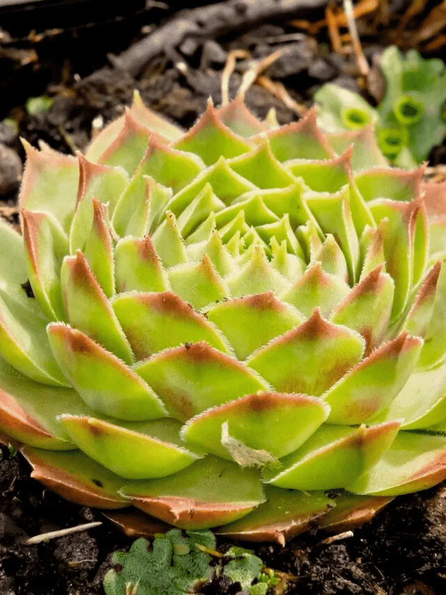 Молодило гибридное 'Gay Kester' (Sempervivum hybridum 'Gay Kester') представляет собой компактную розетку мясистых, плотных листьев насыщенного серо-зелёного цвета с нежной серебристой дымкой и тонкими красноватыми краями, придающими растению изысканный декоративный облик. Листья плотно прилегают друг к другу, формируя аккуратные розетки диаметром около 15 см, устойчивые к неблагоприятным погодным условиям и способные сохранять свою привлекательность круглый год. Цветёт растение редко, выбрасывая высокие стрелки с мелкими звёздчатыми цветами жёлтого оттенка, однако основное достоинство сорта заключается именно в эффектности лиственной массы. Благодаря своей неприхотливости, устойчивости к засухе и морозу молодило прекрасно подходит для выращивания в каменистых садах, альпийских горках и рокариях, где оно образует живописные ковры, украшая ландшафт даже зимой благодаря сохраняющимся зелёным листьям.