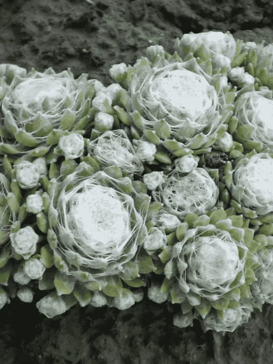 Молодило паутинистое Alabaster (Sempervivum arachnoideum 'Alabaster') — миниатюрная суккулентная розетка, пленительно сияющая нежной бело-зелёной палитрой. Листья плотные, мясистые, слегка вытянутые, словно маленькие жемчужины, покрытые тонкой серебристой сеточкой тонких волосков, придающих растению эффектную бархатистость и лёгкую прозрачность. Цветочные стрелки появляются редко, возвышаясь над компактными кустиками, раскрываясь мелкими звёздчатыми цветами нежно-розового оттенка, оттеняя изысканный облик растения. Этот очаровательный обитатель каменистых склонов предпочитает солнечные места, легко адаптируется к сухим условиям, демонстрируя удивительную выносливость и декоративность даже в суровых условиях альпинариев и рокариев.