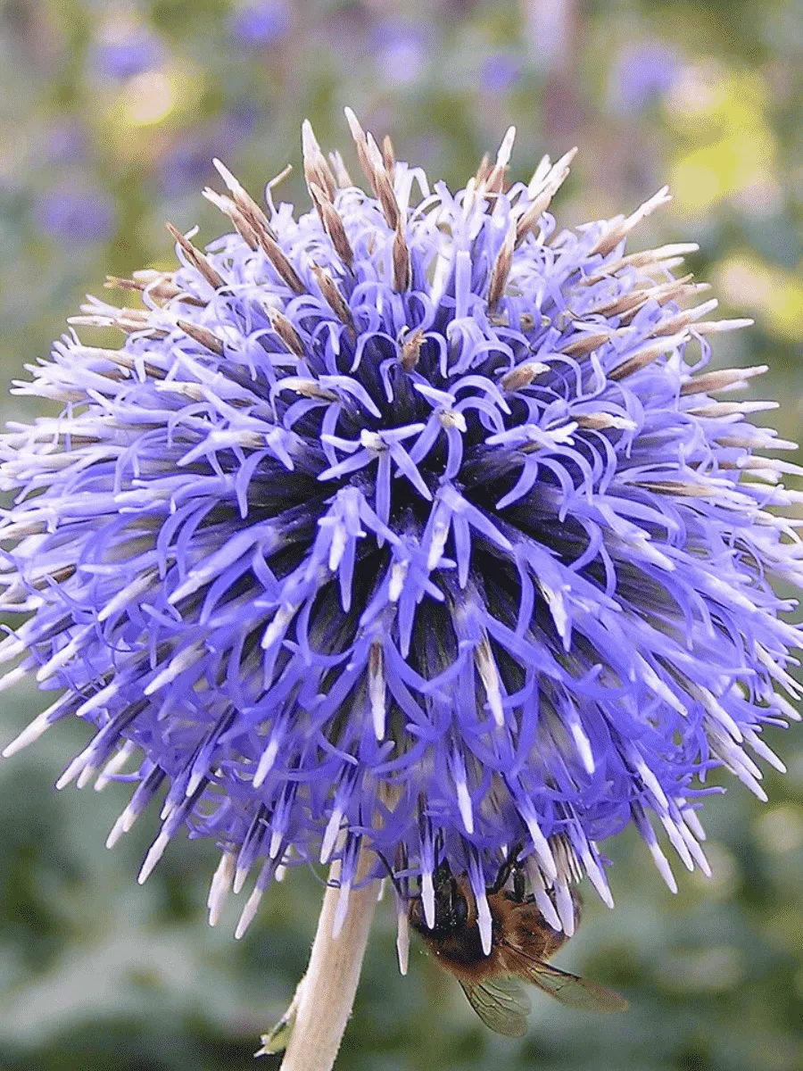 Мордовник банатский *Blue Globe* — элегантная многолетняя культура, поражающая своей строгой красотой и благородством форм. Прямые крепкие стебли высотой до метра несут густые шаровидные соцветия насыщенного синего цвета, словно драгоценные сапфиры, сверкающие среди зелени сада. Листья крупные, серо-зелёные, покрыты мягким пушком, придающим растению бархатистый оттенок и подчёркивающим контраст между серебристым фоном листвы и яркими цветами. Цветёт обильно и продолжительно, начиная с июня и заканчивая сентябрём, привлекая внимание пчёл и бабочек своим ароматом и живописностью. Растение предпочитает солнечные места, хорошо дренированные почвы и легко переносит засуху благодаря мощной корневой системе. Благодаря компактности куста и декоративному облику идеально подходит для миксбордеров, рокариев и одиночных посадок, украшая садовый пейзаж изысканной строгостью и утончённой простотой.