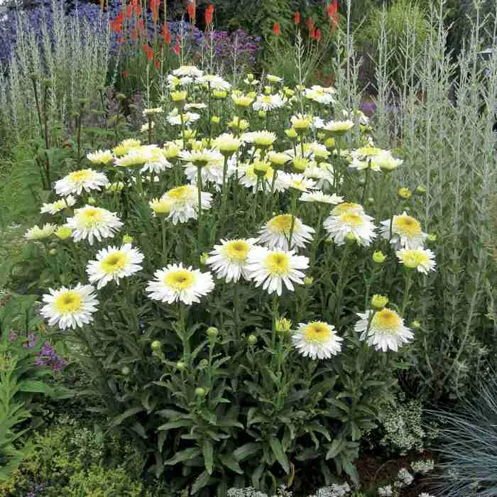 Нивяник наибольший сорта *Real Glory* — роскошная садовая культура, поражающая своей величественной красотой и благородством облика. Высокорослое растение достигает до метра высоты, украшая собой клумбы пышной зелёной листвой и крупными эффектными соцветиями. Листья тёмно-зелёные, удлинённые, слегка зубчатые по краям, образуют плотную прикорневую розетку, подчёркивая стройность высоких стеблей. Цветки крупные, диаметром около десяти сантиметров, состоят из множества белоснежных язычковых лепестков, окружающих ярко-жёлтое центральное соцветие-трубочку. Бутоны раскрываются постепенно, создавая впечатление непрерывности цветения с июня по август. Растение предпочитает солнечные участки, хорошо дренированные почвы и умеренный полив, легко размножается делением куста и прекрасно подходит для срезки, сохраняя свежесть и привлекательность длительное время в вазе.