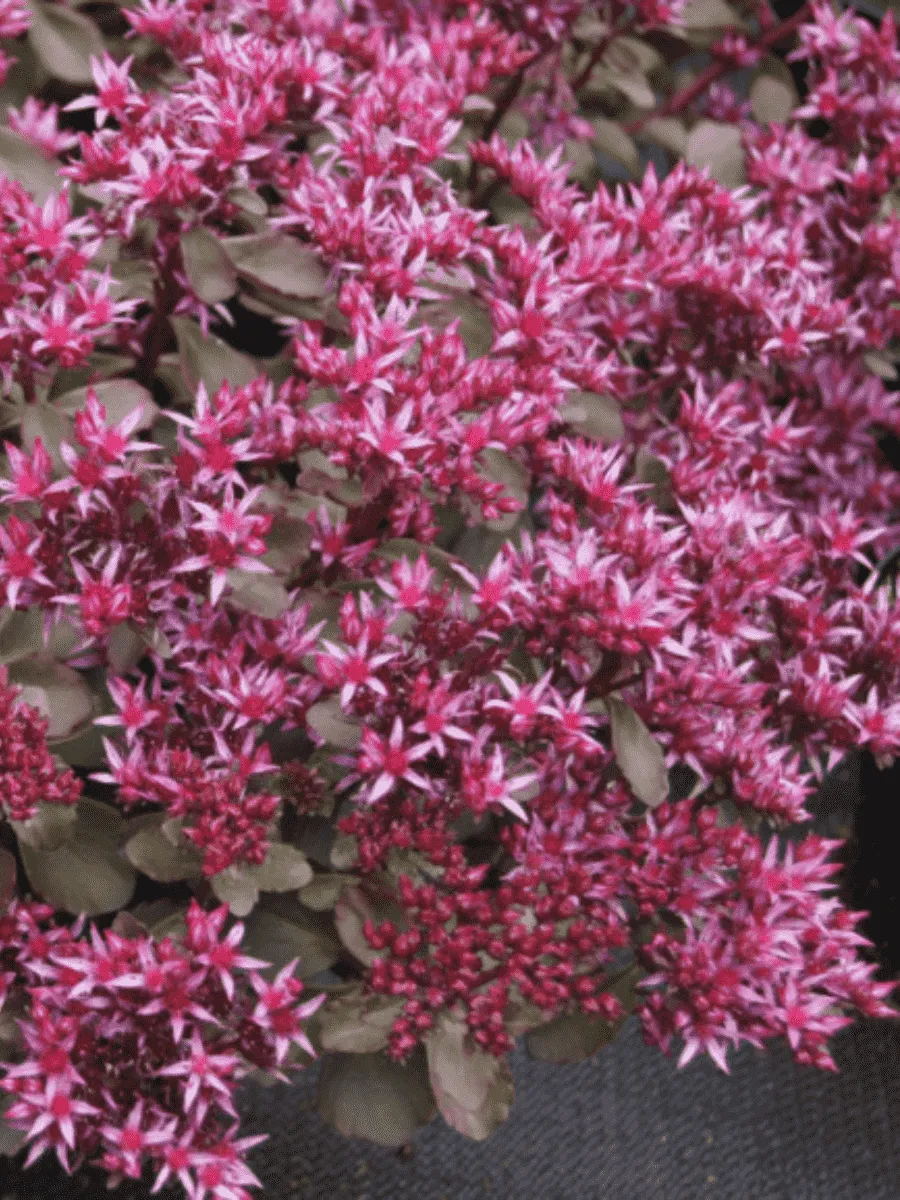 Очиток ложный (*Sedum spurium* 'Fuldaglut') — очаровательное травянистое растение с плотными розовато-красными листьями, словно покрытыми тонким слоем бархата, придающим особую мягкость и глубину оттенкам. Листья овально-ланцетной формы располагаются густо вдоль стелющихся стеблей, создавая живописную ковровую поверхность, идеально подходящую для украшения каменистых садов и альпийских горок. Цветки мелкие, пятилепестковые, собраны в пышные щитковидные соцветия насыщенного кораллово-розового цвета, украшающие растение летом и осенью. Благодаря своей неприхотливости и устойчивости к засухе очиток ложный прекрасно адаптируется к различным условиям произрастания, легко разрастаясь и укрывая почву живым покрывалом ярких оттенков.