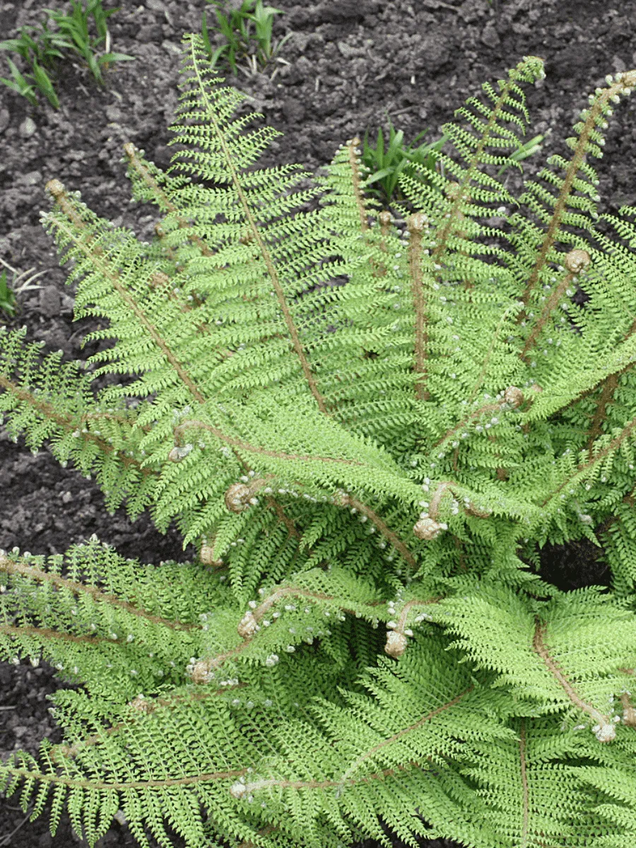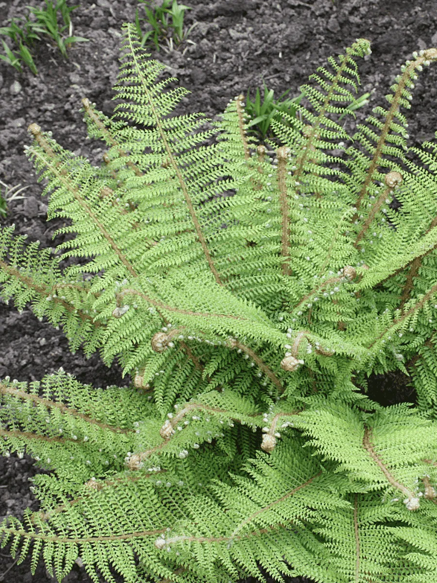 Многорядник щетинковый Dahlem (Polystichum setiferum f. dahlii) — элегантная разновидность папоротника семейства Щитовниковые, поражающая своей утончённой красотой и благородством облика. Это многолетнее растение образует пышную розетку перистых листочков, достигающих высоты до полуметра. Листья многорядника имеют нежную структуру, тонко рассечены на узенькие сегменты, словно искусно вырезанные кружева природы. Их изумрудно-зелёная окраска переливается живым блеском даже в тени густых лесов, где чаще всего встречается этот папоротник. Стебли тонкие, покрытые мелкими чешуями тёмно-коричневого цвета, придающими растению особую декоративность. Цветёт многорядник скрытно, формируя спорангии на нижней стороне листа, незаметные глазу, но играющие важную роль в размножении вида. Растение предпочитает влажные тенистые места, богатые гумусом почвы, распространено преимущественно в лесах Европы, включая территории России, украшая собой лесные массивы своим неповторимым очарованием.