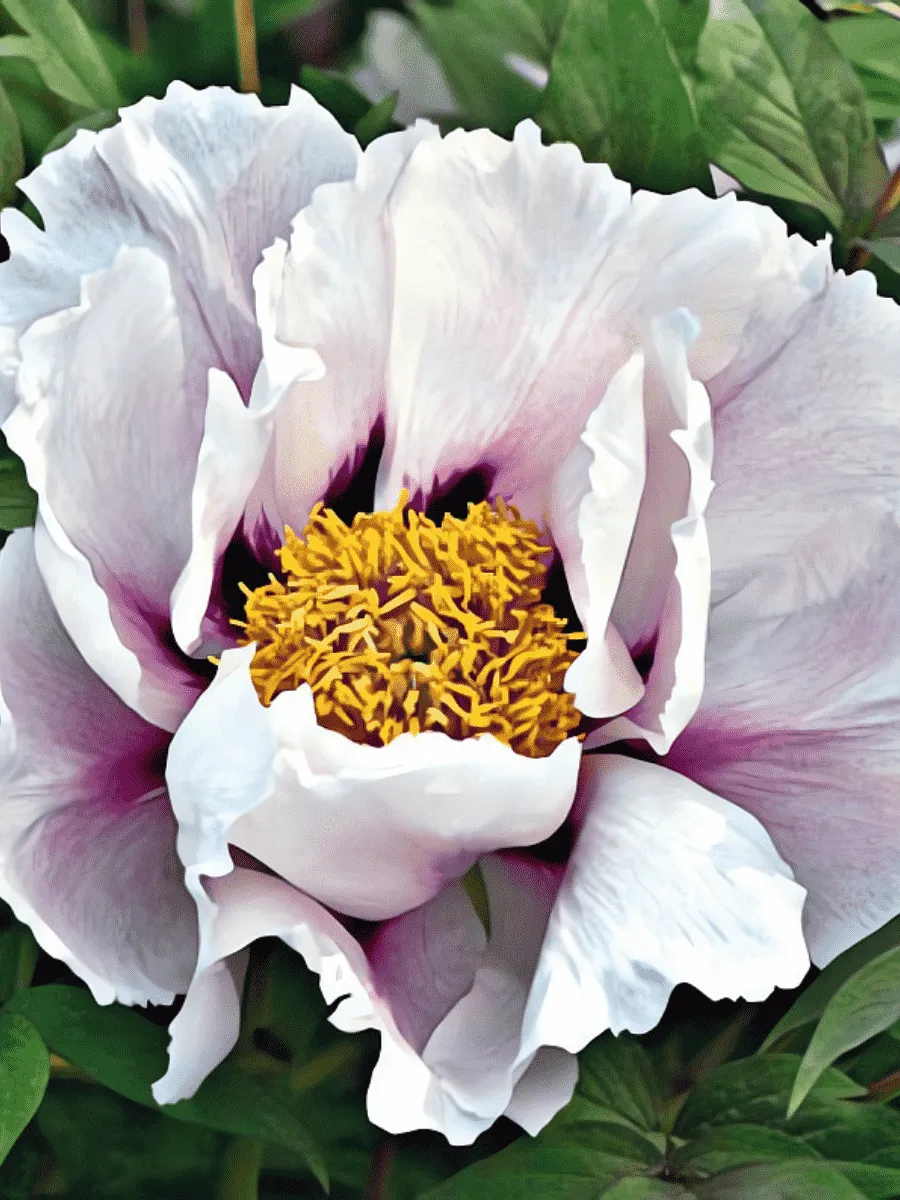 Пион древовидный *White with Black Eye* — роскошная садовая культура, поражающая своей утончённой красотой и благородством форм. Это многолетний кустарник высотой до полутора метров с мощной древеснеющей корневой системой и крепкими ветвями, покрытыми крупной тёмно-зелёной листвой насыщенного оттенка, слегка блестящей и рельефной, придающей растению особую декоративность даже вне периода цветения. Цветки крупные, диаметром около 15–20 см, махровые, белоснежные с нежнейшей кремово-жёлтой сердцевиной, контрастирующей с глубоким чёрным пятном вокруг тычинок, создавая эффектную игру света и тени внутри цветка. Аромат тонкий, едва уловимый, подчёркивающий изысканность облика пиона. Растёт медленно, ежегодно прибавляя несколько новых ветвей, формируя компактную крону правильной формы. Предпочитает солнечные места с плодородной почвой, устойчив к морозам средней полосы России, зимует без дополнительного укрытия. Прекрасно смотрится в одиночных посадках, миксбордерах и композициях с хвойниками, дополняя ландшафт сада элегантностью и величием старинных садов.