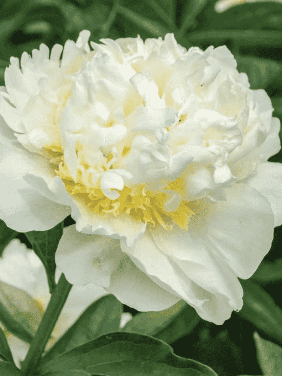 Пион молочноцветковый сорта *Bridal Icing* пленяет взор нежностью белоснежных лепестков, словно покрытых тонким слоем сахарной пудры, отчего соцветия приобретают изысканный фарфоровый оттенок. Крупные цветы диаметром до 15 см раскрываются пышными многослойными бутонами, источающими тонкий аромат ванили и свежести весеннего утра. Листья темно-зелёные, рассечённые, слегка блестящие, придают растению благородную строгость и подчёркивают воздушность цветков. Куст компактный, высотой около метра, формирует аккуратную округлую крону, идеально подходящую для оформления садов и парков. Цветёт обильно и продолжительно, начиная с конца мая и заканчивая серединой июня, радуя глаз своей утончённой красотой и элегантностью.