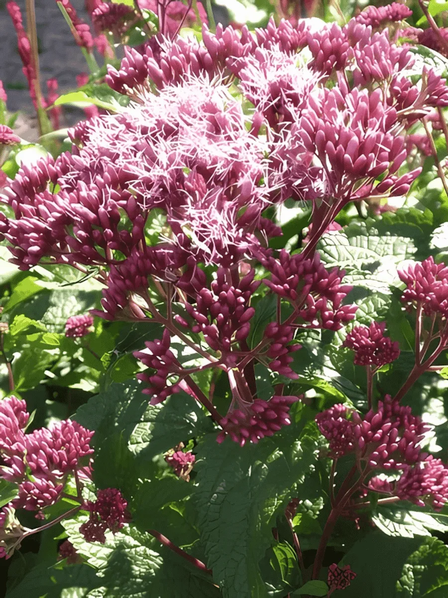 Посконник пятнистый 'Red Dwarf' — элегантная травянистая культура, покоряющая сердца садоводов своей утончённой красотой и компактностью форм. Это растение отличается плотным кустиком высотой около полуметра, густо покрытым крупными сердцевидными листьями насыщенного зелёного цвета с яркими пурпурными прожилками, придающими листве эффектную декоративность даже вне периода цветения. Цветёт посконник обильно и продолжительно, начиная с середины лета до первых заморозков, покрываясь многочисленными мелкими трубчатыми цветами глубокого винно-красного оттенка, собранными в крупные метельчатые соцветия, привлекающие внимание своим благородством и изысканностью. Растение предпочитает солнечные места, хорошо дренированные почвы и умеренный полив, прекрасно адаптируясь к различным климатическим условиям и становясь украшением любого сада благодаря своему яркому внешнему виду и неприхотливости в уходе.