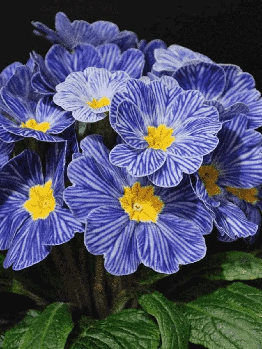 Примула бесстебельная сорта *Blue Zebra* пленяет взор нежностью своего облика и изысканностью форм. Это компактное растение высотой всего около десяти сантиметров образует плотную розетку крупных сердцевидных листьев насыщенного зелёного цвета с волнистым краем и бархатисто-матовым отливом. Листья расположены близко друг к другу, создавая впечатление мягкого пушистого ковра. Цветоносы тонкие и короткие, едва возвышаются над лиственной массой, увенчанные крупными одиночными цветами диаметром до пяти сантиметров. Лепестки цветков нежно-голубые с тёмной фиолетово-синей полосатой каймой, придающей особую декоративность растению. Цветение продолжительное, начинается ранней весной и продолжается несколько недель, наполняя сад чарующим ароматом свежести и весеннего обновления. Предпочитает полутень и влажные плодородные почвы, легко размножается делением куста и семенами, быстро разрастаясь и формируя живописные островки среди тенистых уголков сада.