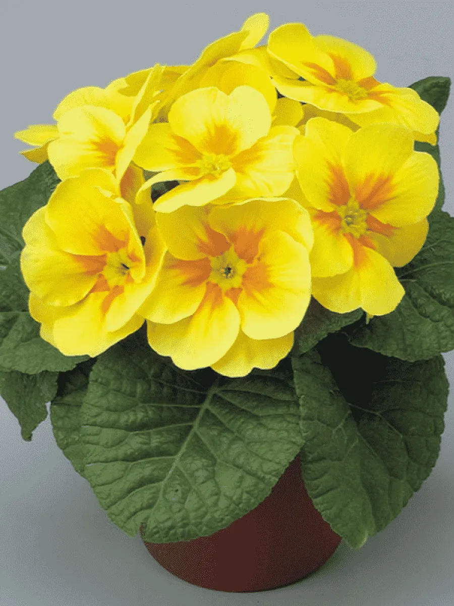 Примула Хетор Йеллоу (Primula hethor yellow) пленяет взор нежностью своего облика и изысканностью форм. Это многолетнее травянистое растение образует компактную розетку крупных округло-овальных листьев насыщенного зелёного цвета с бархатистым отливом, слегка волнистых по краям и покрытых едва заметной серебристо-зелёной сеточкой прожилок. Из центра розетки весной появляются невысокие цветоносы, увенчанные яркими жёлтыми цветами, собранными в рыхлые зонтичные соцветия. Лепестки цветков крупные, широко раскрытые, словно солнечные лучи, сияют мягким золотистым светом, привлекая внимание своей простотой и элегантностью. Растёт примула преимущественно во влажных тенистых местах, предпочитая богатые гумусом почвы лесных полян и берегов ручьёв, где её яркие цветы создают живописные островки света среди зелени лесной подстилки.