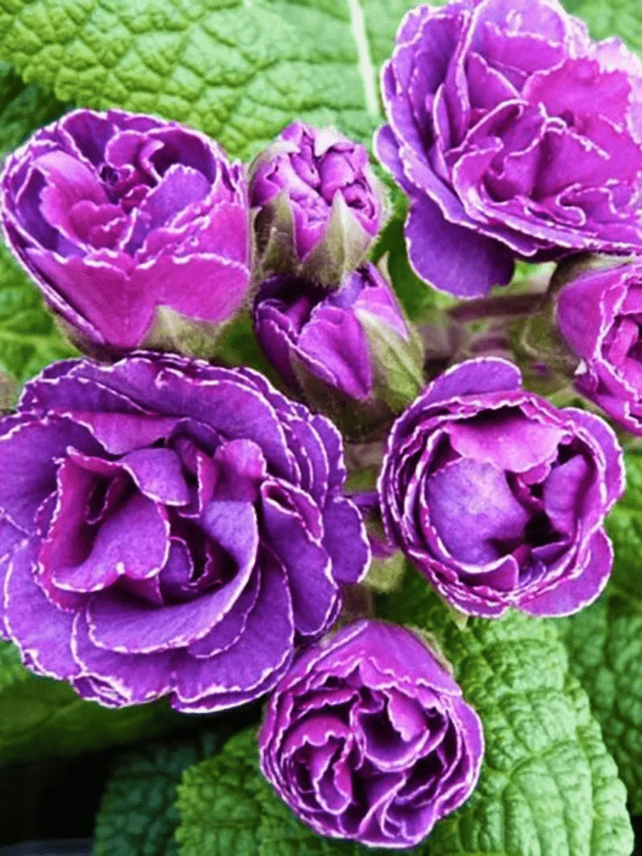 Примула обыкновенная сорта *Frou Frou* пленяет взор нежностью своего облика и утончённостью форм. Это невысокое травянистое растение высотой до 15–20 см образует компактную розетку округлых бархатистых листьев насыщенно-зелёного цвета с волнистыми краями, словно кружевная манжета старинной рубашки. Из центра розетки поднимаются тонкие цветоносы, увенчанные очаровательными цветами диаметром около 4–6 см. Лепестки цветков имеют необычную гофрированную структуру, создавая впечатление изысканного цветка ручной работы. Окраска лепестков варьируется от нежно-розового до ярко-малинового оттенка, иногда переходящего в белый центр, придавая растению особую декоративность. Цветёт примула ранней весной, радуя глаз яркими красками после долгой зимы. Предпочитает полутень и влажные плодородные почвы, легко размножается делением куста и семенами, широко используется в ландшафтном дизайне садов и парков благодаря своей неприхотливости и привлекательному внешнему виду.