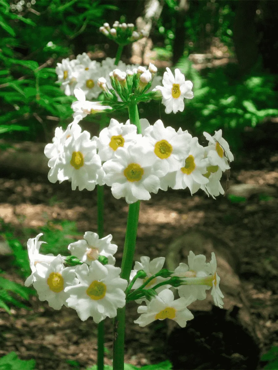 Примула японская Alba — изысканное растение с нежной белоснежной красотой цветков, покоряющих своей утончённостью и элегантностью. Листья крупные, округло-сердцевидные, слегка волнистые по краям, насыщенно-зелёного цвета, образуют пышную прикорневую розетку, словно мягкий зелёный ковёр, украшающий садовые композиции. Цветоносы возвышаются над листвой стройными свечками, увенчанные шапочками ароматных белых цветов, обладающих лёгким приятным ароматом. Бутоны раскрываются постепенно, создавая эффект непрерывности цветения, которое начинается ранней весной и продолжается до начала лета. Растёт примула преимущественно во влажных тенистых местах, предпочитая богатые гумусом почвы, где её красота проявляется особенно ярко. Благодаря неприхотливости и декоративности она широко используется в ландшафтном дизайне, добавляя саду атмосферу свежести и весеннего очарования.