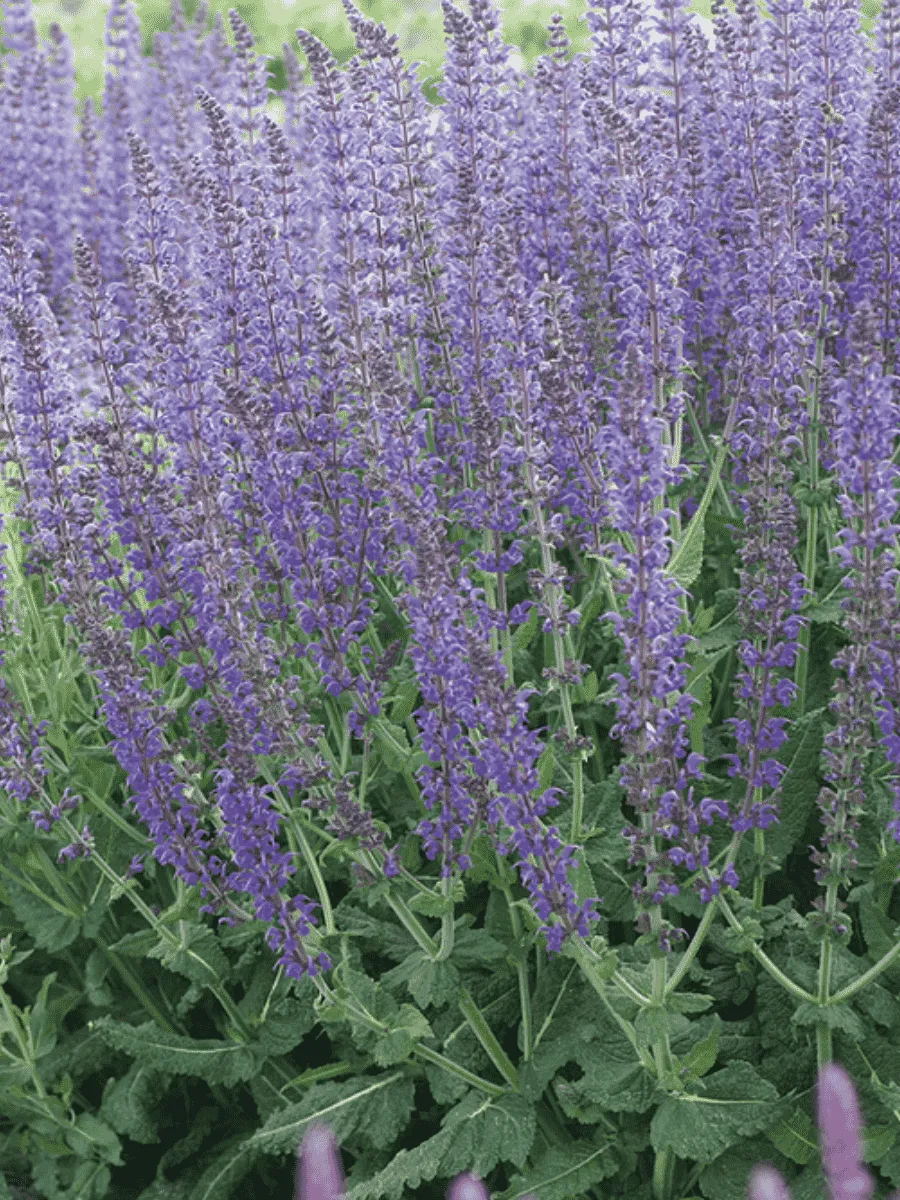 Шалфей дубравный *Mainacht* пленяет взор своей изысканной красотой и благородством облика. Это многолетнее травянистое растение достигает высоты около полуметра, обладая прямостоячими крепкими стеблями, покрытыми нежной пушистой опушкой. Листья крупные, сердцевидные, слегка зазубренные по краям, окрашены в насыщенный зелёный оттенок с серебристым отливом благодаря тонкому слою волосков, придающих растению особую бархатистость и элегантность. Цветки шалфея собраны в плотные колосовидные соцветия, возвышающиеся над листвой подобно свечам, украшенным множеством мелких цветков глубокого сине-фиолетового цвета, словно драгоценные сапфиры, сверкающие среди зелени. Период цветения продолжительный, начинается поздней весной и длится до середины лета, привлекая внимание насекомых-опылителей своим ароматом и яркой окраской. Растёт шалфей преимущественно на плодородных почвах лесных опушек и полян, предпочитая умеренно влажные места с хорошим освещением, где раскрывается во всей красе, создавая живописную картину летнего сада.