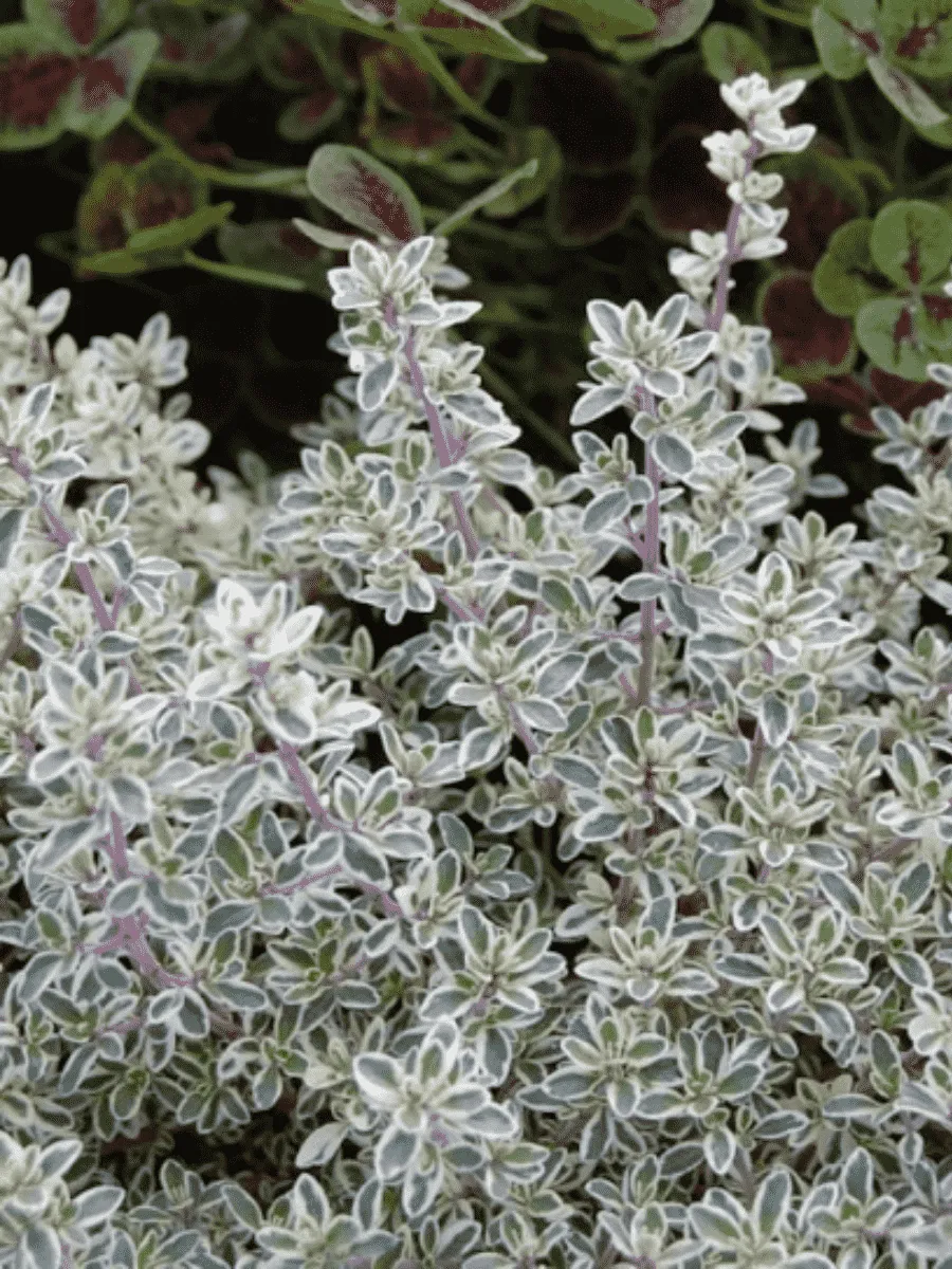 Тимьян обыкновенный 'Silver Posie' пленяет взор нежной серебристо-зелёной листвой, словно покрытой тонким слоем драгоценной пыли. Его миниатюрные листочки овальной формы густо покрывают компактные кустики высотой до 15 см, создавая плотную бархатистую подушку. Цветёт растение обильно мелкими розово-лиловыми цветами, собранными в очаровательные соцветия-шапки диаметром около 4–6 см, украшая садовый пейзаж с июня по август. Этот ароматный полукустарник предпочитает солнечные места и лёгкую плодородную почву, легко переносит засуху и морозы, становясь украшением каменистых садов, альпийских горок и бордюров.