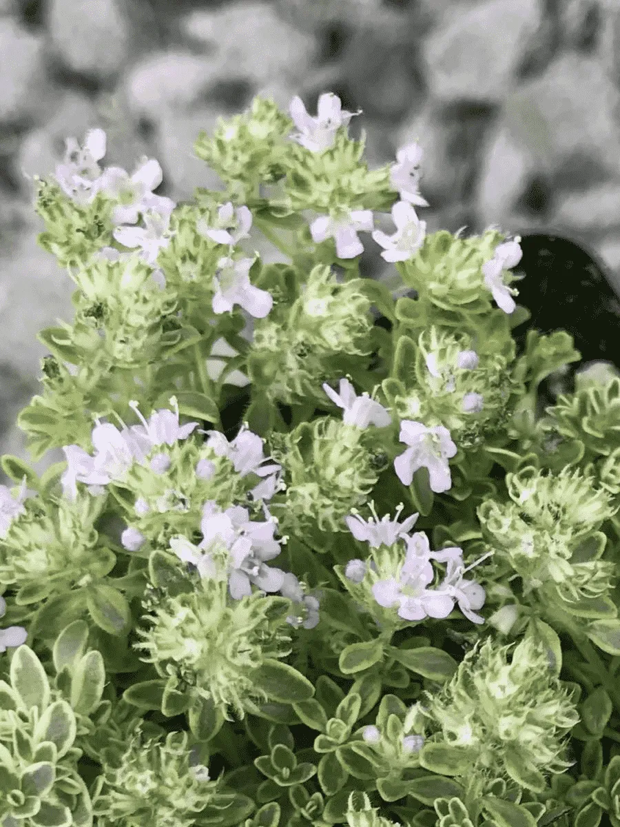 Тимьян ранний сорта *Highland Cream* пленяет взор нежностью своего облика и утончённостью аромата. Это компактный полукустарник высотой до 15 см, обладающий густой кроной из мелких овальных листочков серебристо-зелёной окраски с лёгким кремовым оттенком, придающим растению особую изысканность. Листья покрыты едва заметным пушком, благодаря чему поверхность кажется бархатистой и мягкой. Цветёт тимьян обильно мелкими розово-лиловыми цветами, собранными в плотные головки соцветий, украшая садовый участок очаровательным ковром с июня по август. Растение предпочитает солнечные места, хорошо дренированные почвы и легко переносит засуху, радуя садоводов своей неприхотливостью и декоративностью круглый год.